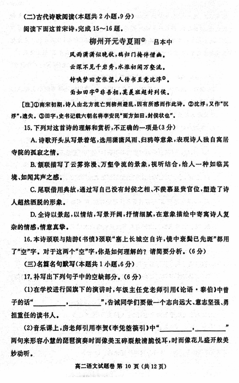 四川遂宁2024-2025学年高二上学期期末语文试题及答案 时间:2025-01-27 河南 高中语文 四川遂宁2024-2025学年高二上学期期末语文考试已于近日开考,为方便考生考后及时查看考试情况,查漏补缺、弥补不足,本文整理了试题答案解析相关信息! 语文试题及答案解析