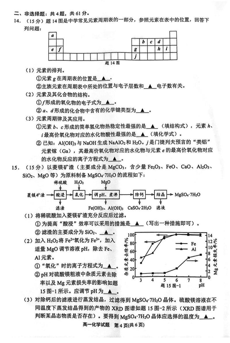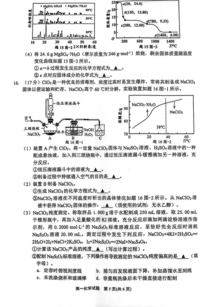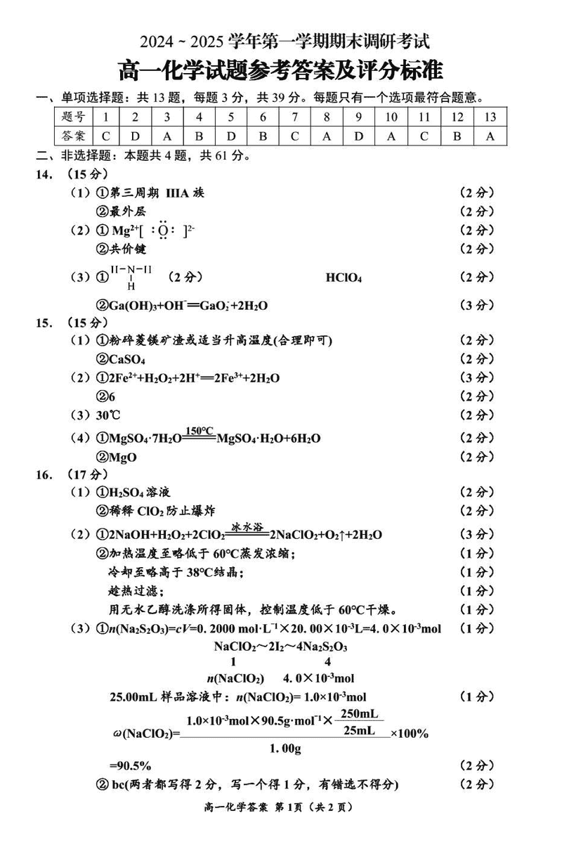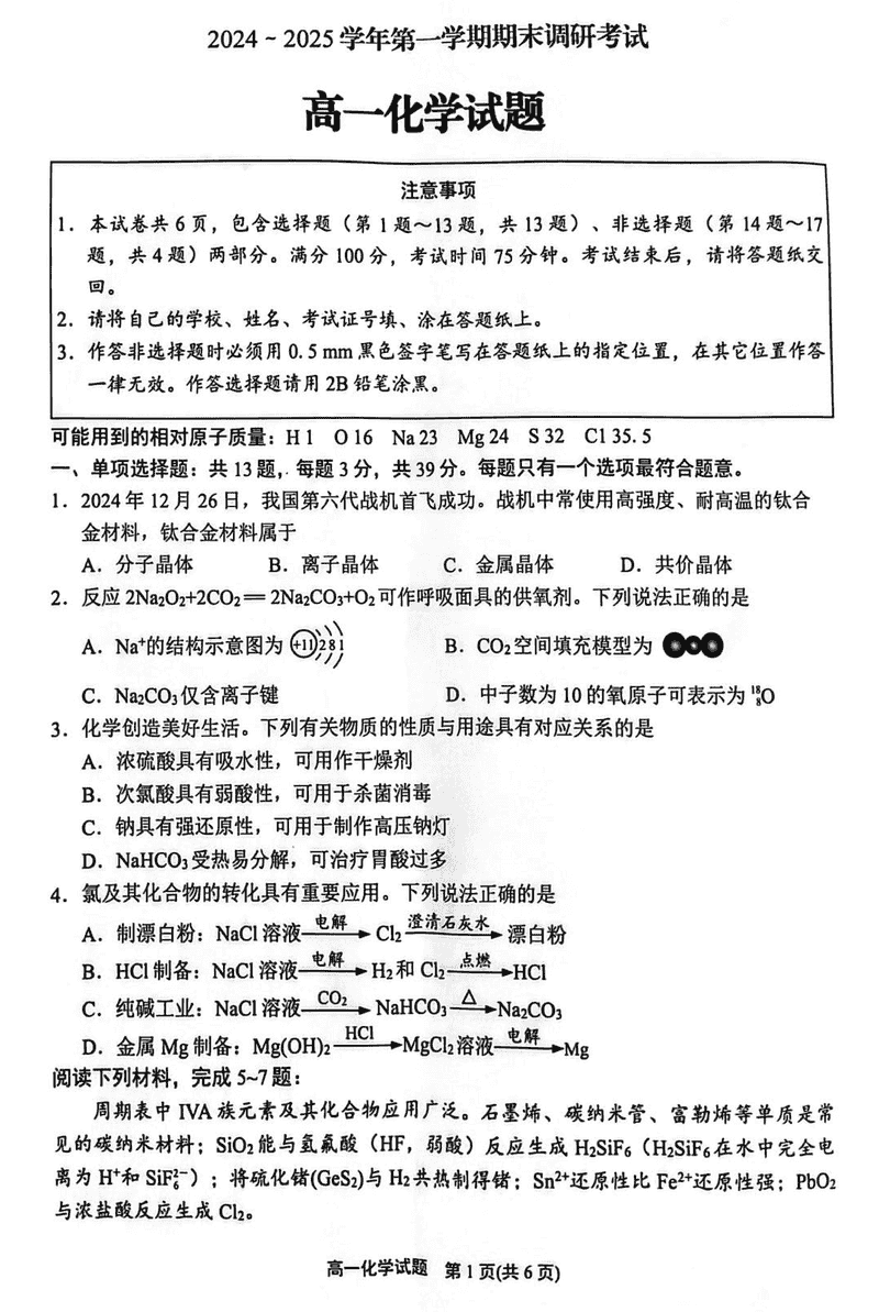 江苏连云港2024-2025学年高一上学期期末调研化学试题及答案 时间:2025-01-27 江苏 高中化学 江苏省连云港市2024-2025学年高一上学期期末调研化学考试已于近日开考,为方便考生考后及时查看考试情况,查漏补缺、弥补不足,本文整理了试题答案解析相关信息! 化学试题及答案解析