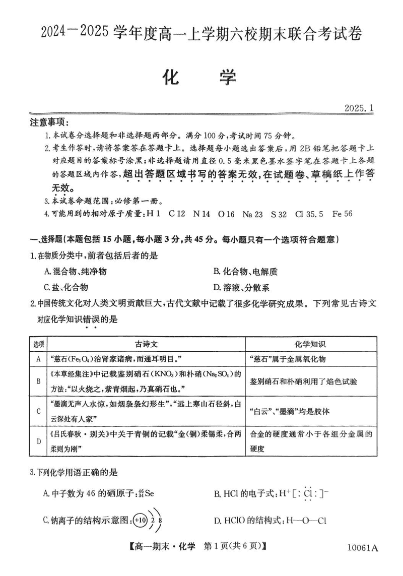 哈尔滨六校2024-2025学年高一上学期期末联考化学试题及答案 时间:2025-01-27 黑龙江 高中化学 哈尔滨市六校2024-2025学年高一上学期期末联考化学考试已于近日开考,为方便考生考后及时查看考试情况,查漏补缺、弥补不足,本文整理了试题答案解析相关信息! 化学试题及答案解析
