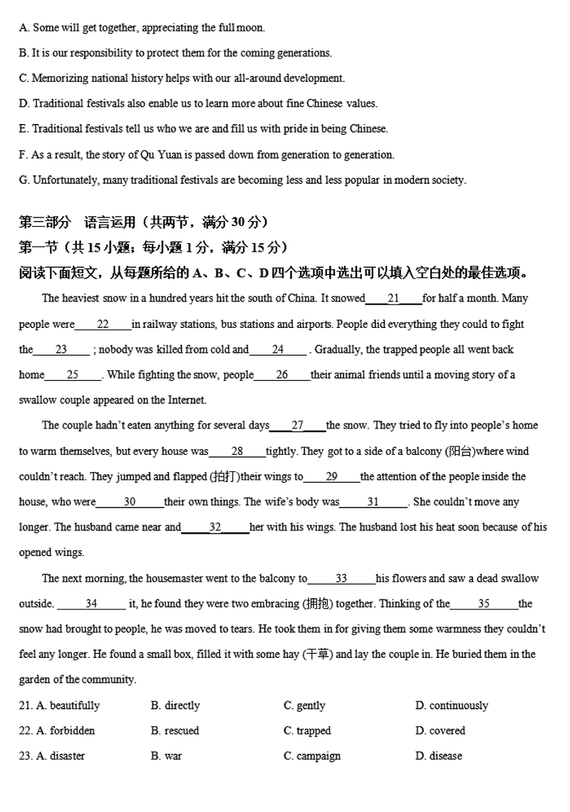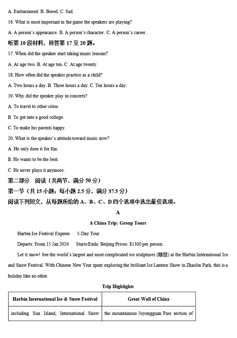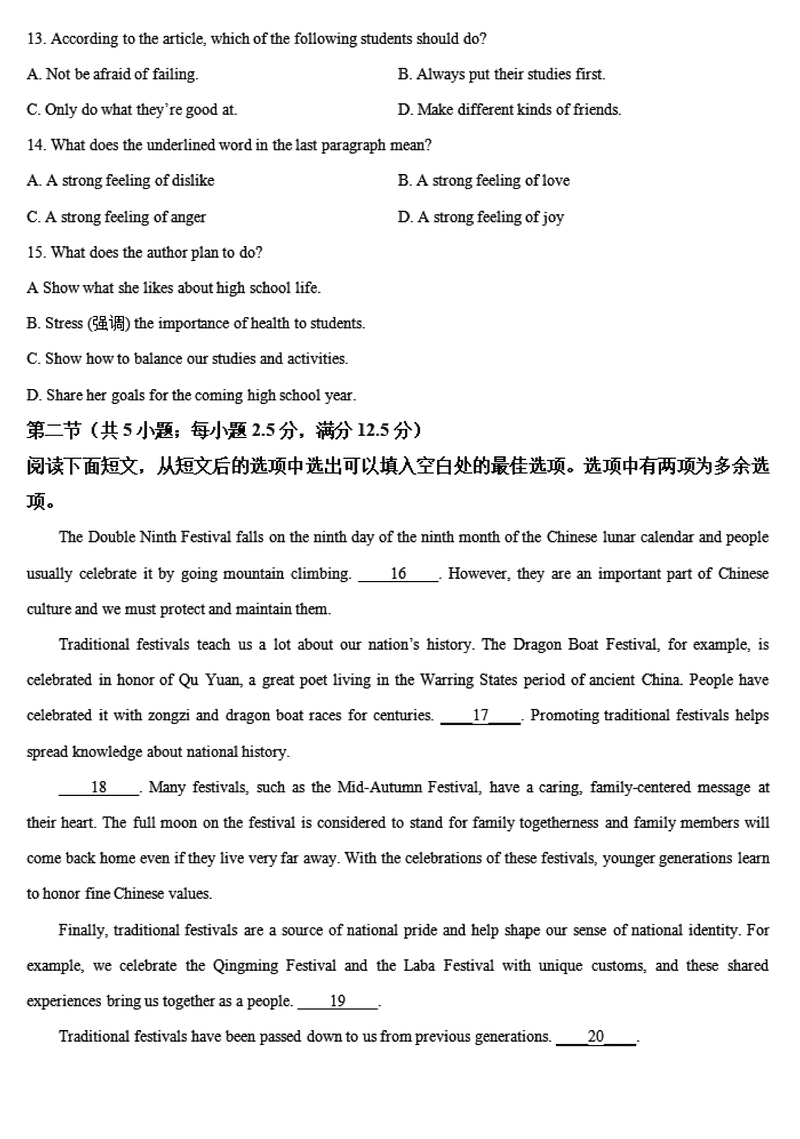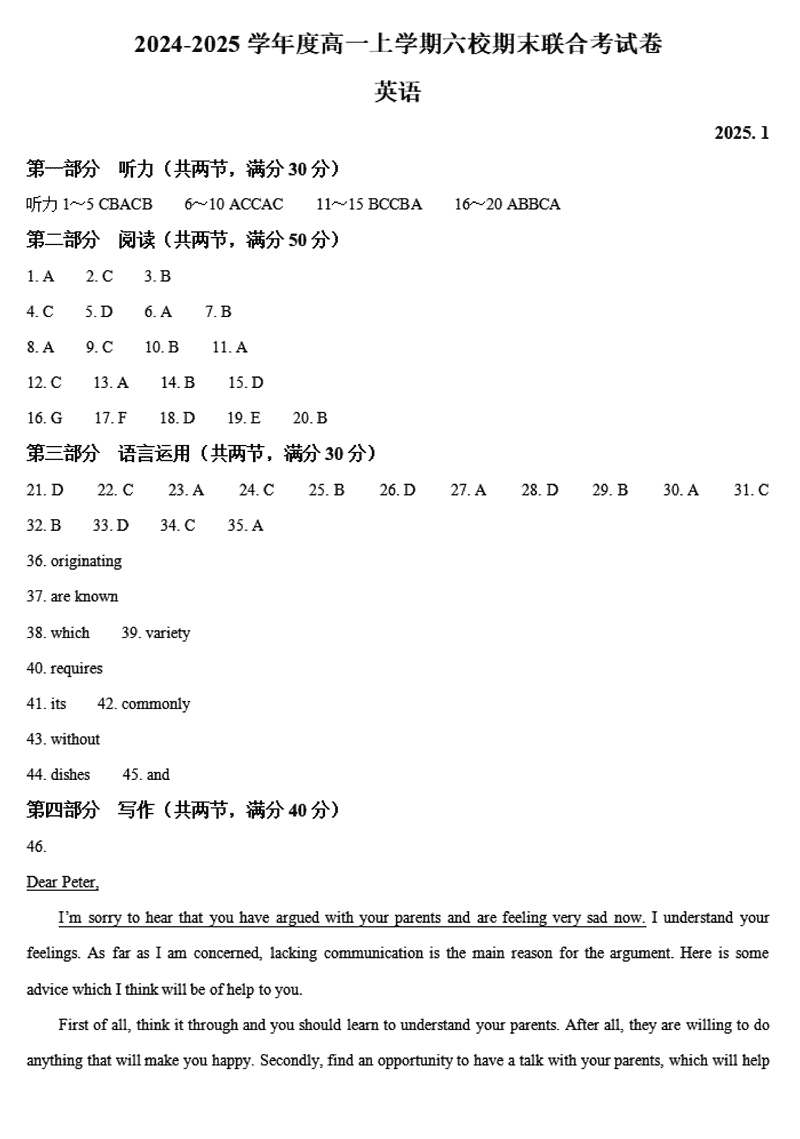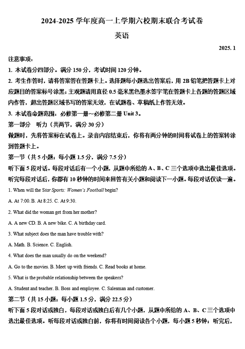 哈尔滨六校2024-2025学年高一上学期期末联考英语试题及答案 时间:2025-01-27 黑龙江 高中英语 哈尔滨市六校2024-2025学年高一上学期期末联考英语考试已于近日开考,为方便考生考后及时查看考试情况,查漏补缺、弥补不足,本文整理了试题答案解析相关信息! 英语试题及答案解析