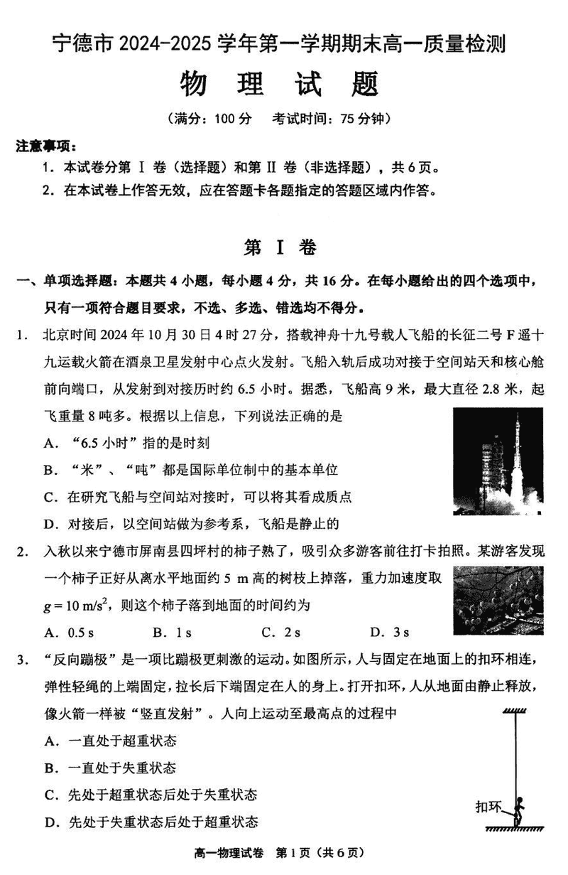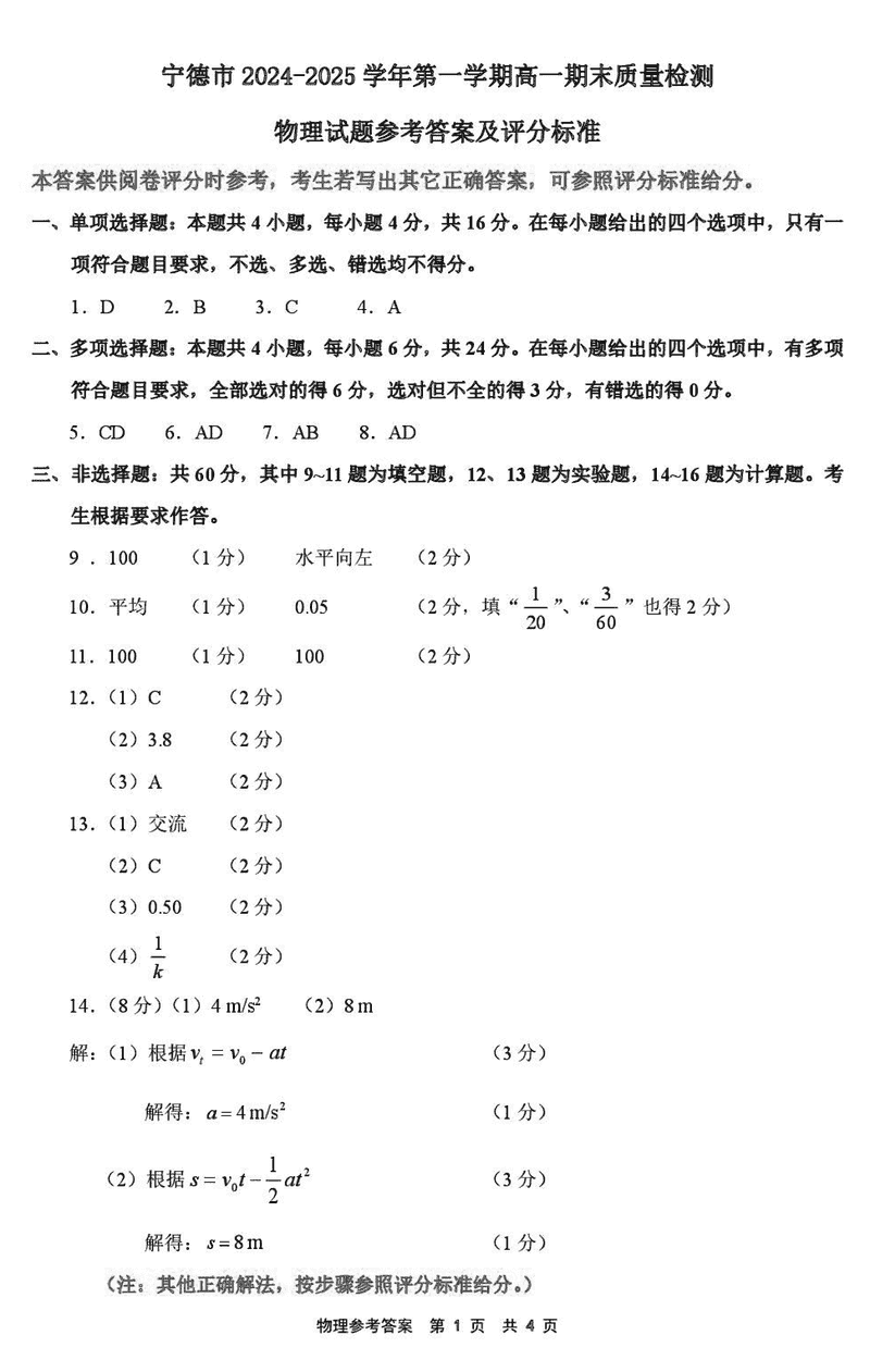 福建宁德2024-2025学年高一上学期1月期末物理试题及答案 时间:2025-01-27 福建 高中物理 福建宁德2024-2025学年高一上学期1月期末物理考试已于近日开考,为方便考生考后及时查看考试情况,查漏补缺、弥补不足,本文整理了试题答案解析相关信息! 物理试题及答案解析