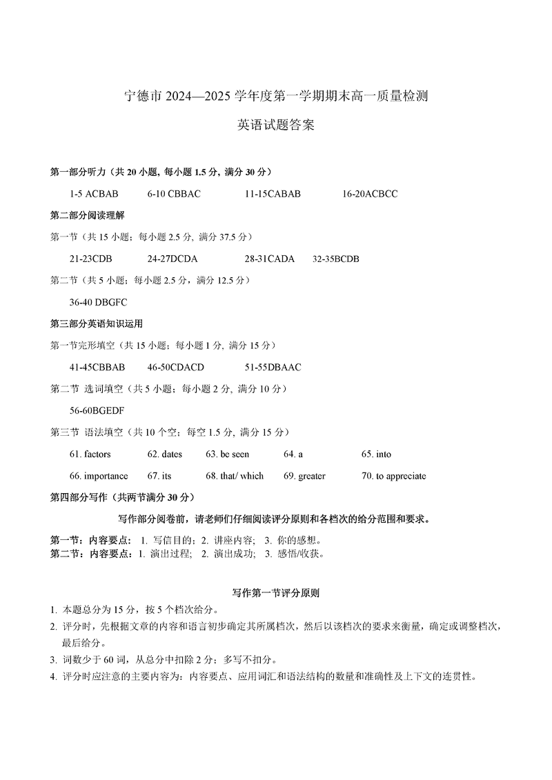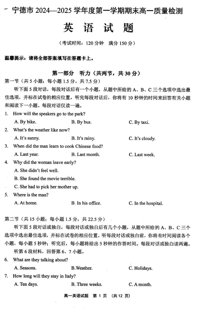 福建宁德2024-2025学年高一上学期1月期末英语试题及答案 时间:2025-01-27 福建 高中英语 福建宁德2024-2025学年高一上学期1月期末英语考试已于近日开考,为方便考生考后及时查看考试情况,查漏补缺、弥补不足,本文整理了试题答案解析相关信息! 英语试题及答案解析