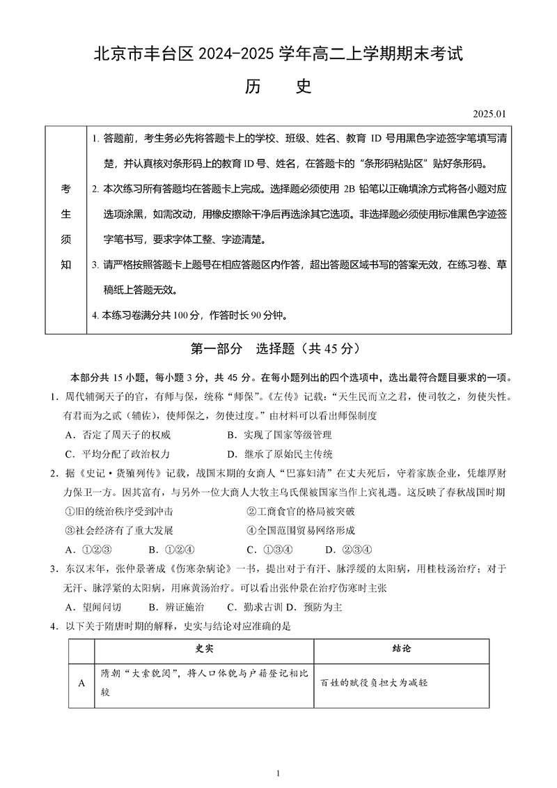 北京市丰台区2024-2025学年高二上学期期末历史试题及答案 时间:2025-01-27 北京 高中历史 北京市丰台区2024-2025学年高二上学期期末历史考试已于近日开考,为方便考生考后及时查看考试情况,查漏补缺、弥补不足,本文整理了试题答案解析相关信息! 历史试题及答案解析