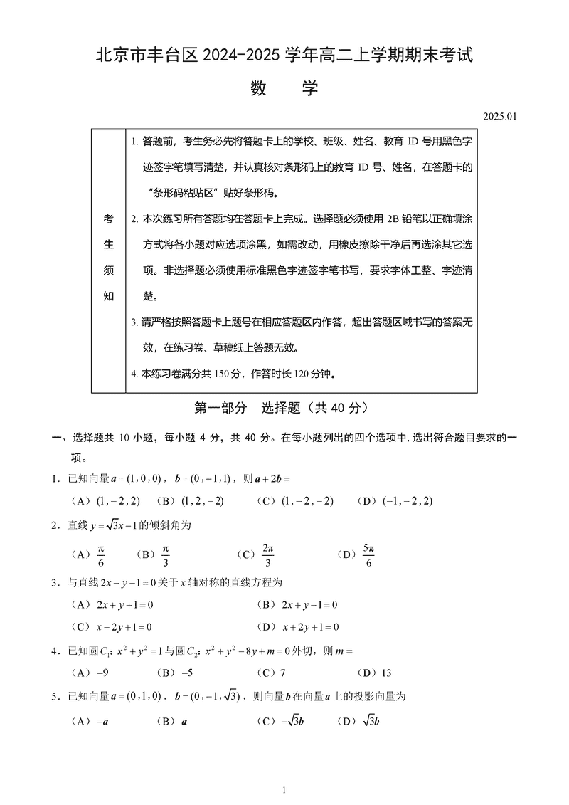 北京市丰台区2024-2025学年高二上学期期末数学试题及答案 时间:2025-01-27 北京 高中数学 北京市丰台区2024-2025学年高二上学期期末数学考试已于近日开考,为方便考生考后及时查看考试情况,查漏补缺、弥补不足,本文整理了试题答案解析相关信息! 数学试题及答案解析