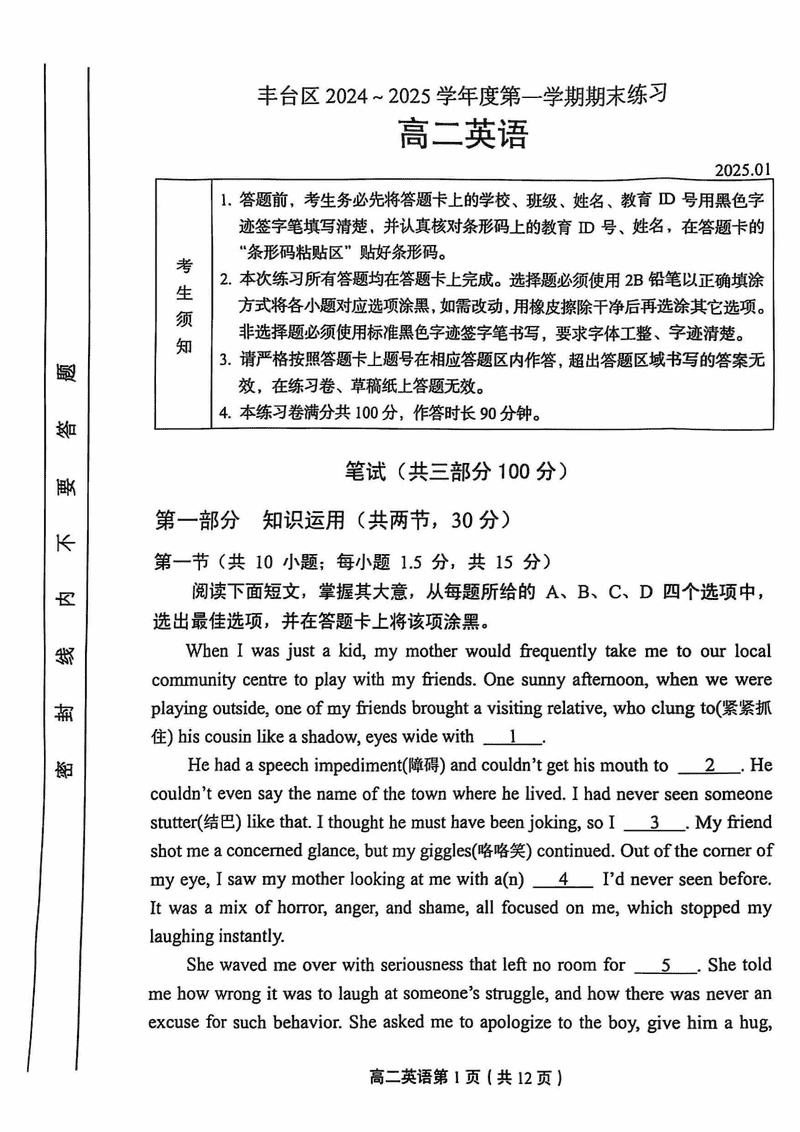 北京市丰台区2024-2025学年高二上学期期末英语试题及答案 时间:2025-01-27 北京 高中英语 北京市丰台区2024-2025学年高二上学期期末英语考试已于近日开考,为方便考生考后及时查看考试情况,查漏补缺、弥补不足,本文整理了试题答案解析相关信息! 英语试题及答案解析