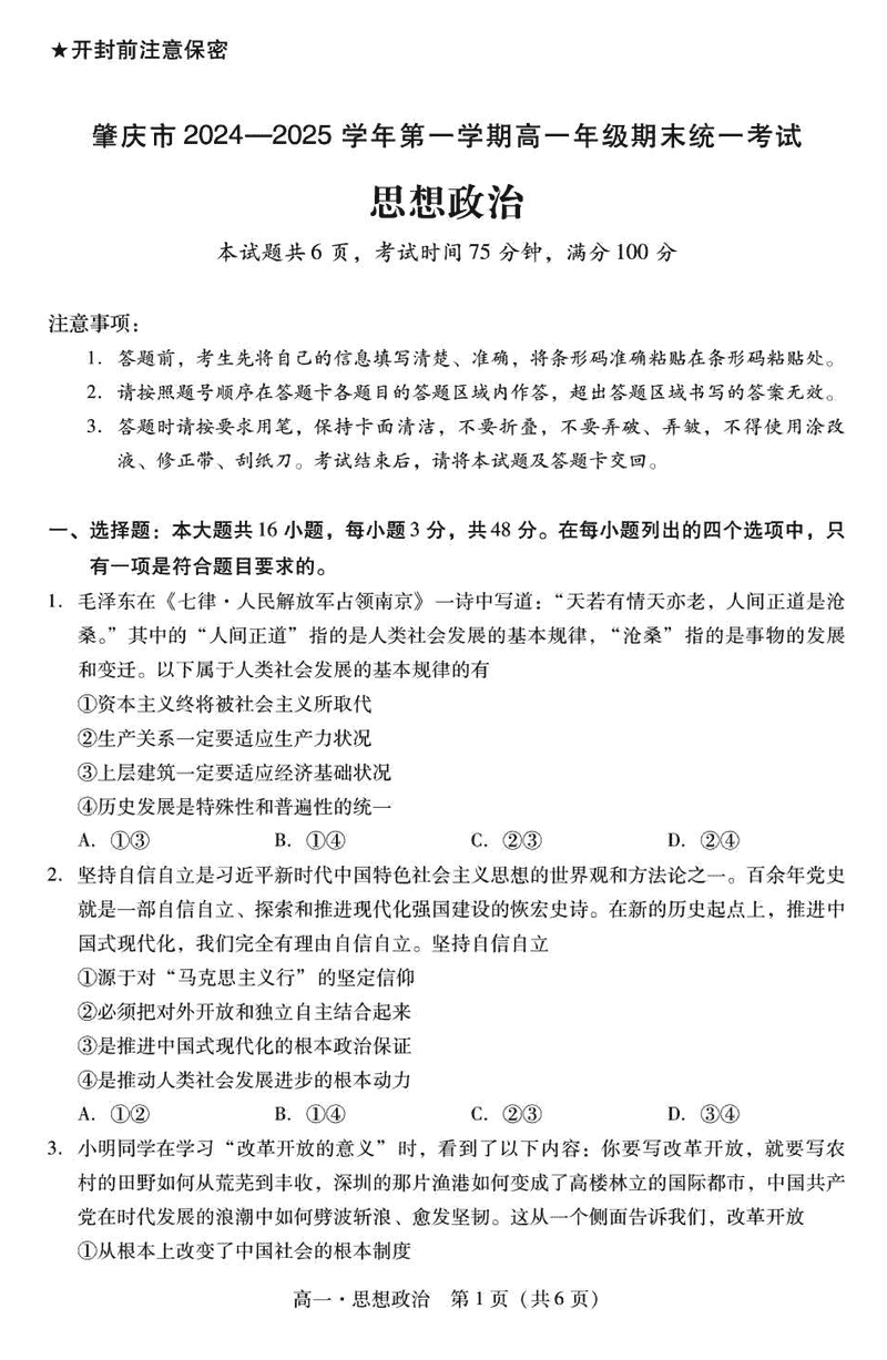 广东肇庆2024-2025学年高一上学期期末政治试题及答案 时间:2025-01-27 广东 高中政治 广东省肇庆市2024-2025学年高一上学期期末政治考试已于近日开考,为方便考生考后及时查看考试情况,查漏补缺、弥补不足,本文整理了试题答案解析相关信息! 政治试题及答案解析