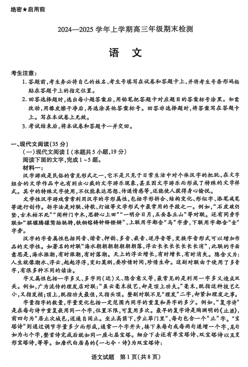 安徽天一大联考2025届高三上学期1月期末检测语文试题及答案