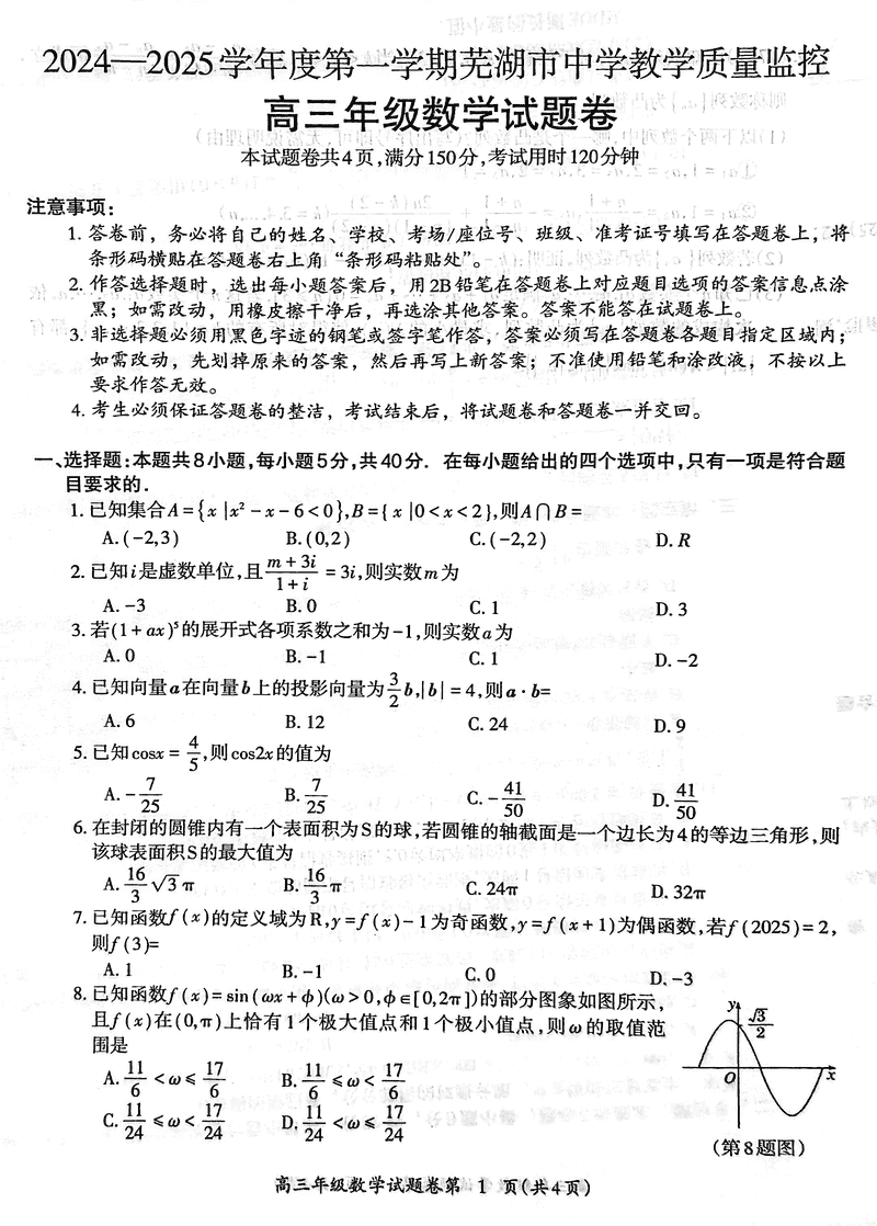 安徽芜湖2025届高三上学期1月期末数学试题及答案 时间:2025-01-27 安徽 数学试题 安徽芜湖2025届高三上学期1月期末数学考试已于近日开考,为方便考生考后及时查看考试情况,查漏补缺、弥补不足,本文整理了试题答案解析相关信息! 汇总:安徽芜湖2025届高三上学期1月期末试题及答案汇总 数学试题及答案解析