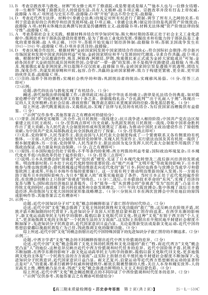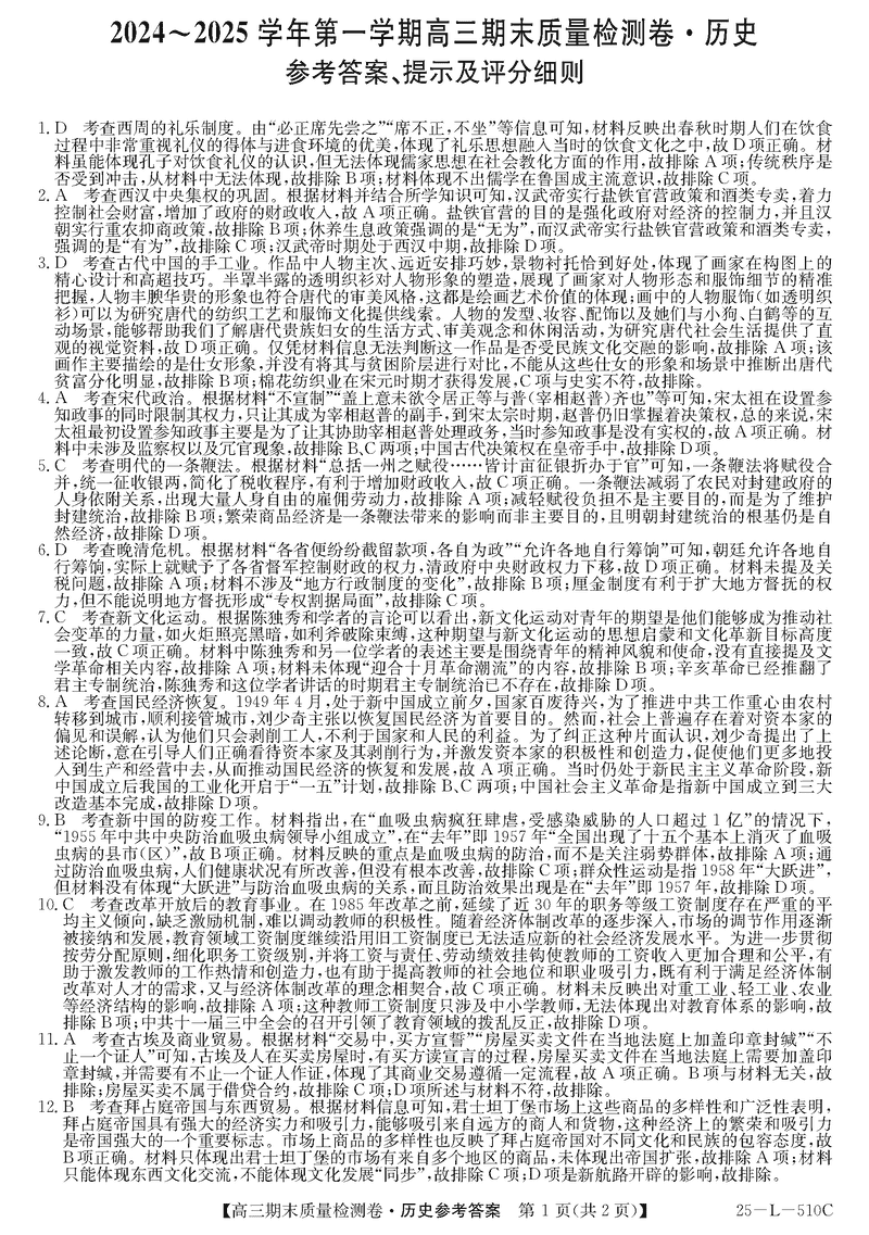 山西三晋卓越联盟2025届高三上学期期末历史试题及答案
