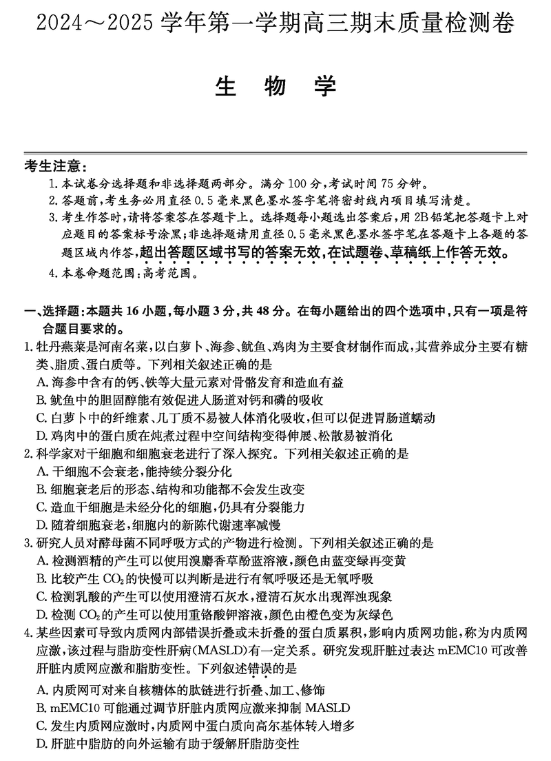 山西三晋卓越联盟2025届高三上学期期末生物试题及答案