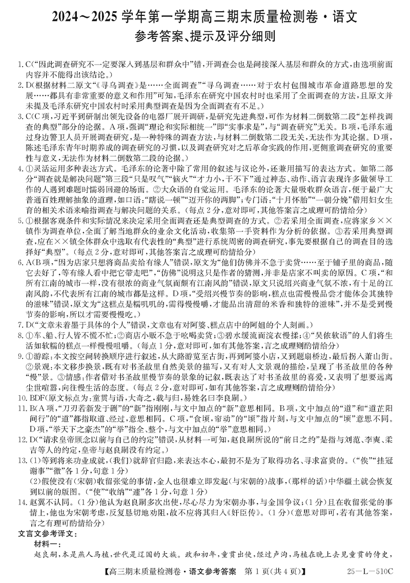 山西三晋卓越联盟2025届高三上学期期末语文试题及答案