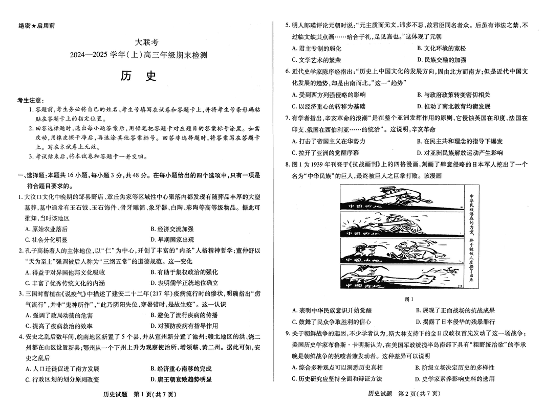 河南天一大联考2025年高三上学期1月期末历史试题及答案