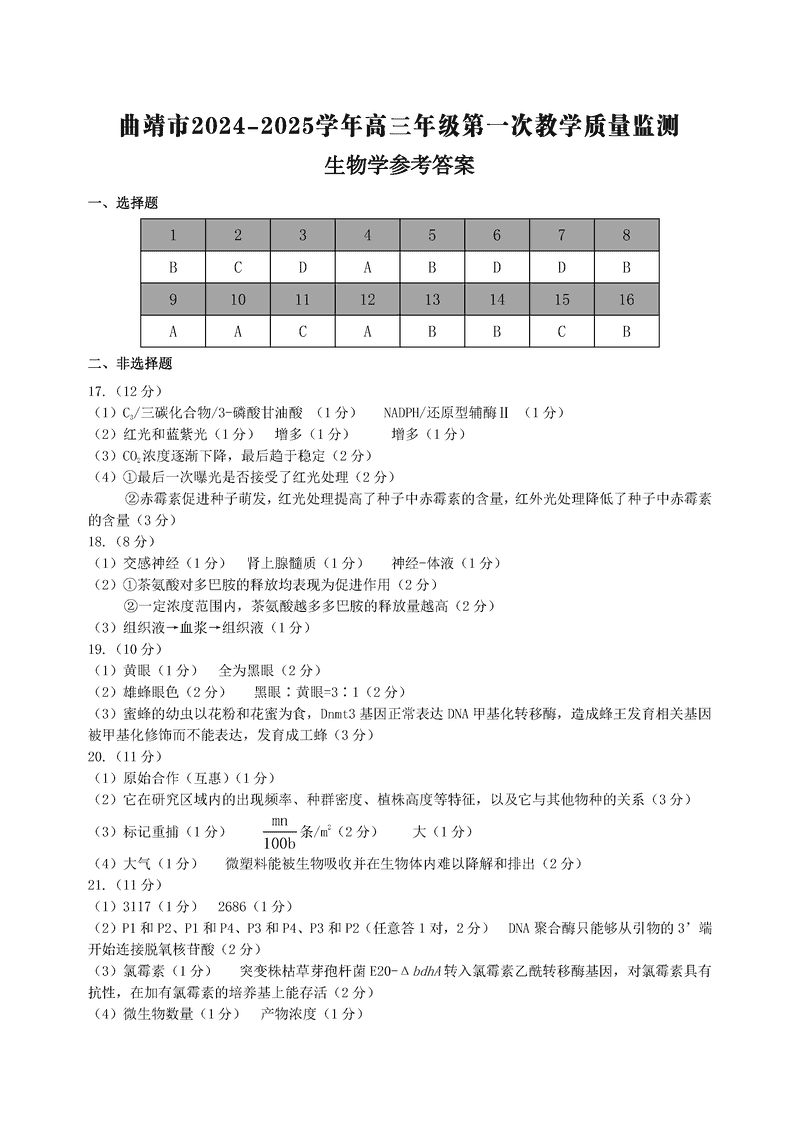 云南曲靖2025届高三上学期第一次教学质量监测生物考试已于近日开考,为方便考生考后及时查看考试情况,查漏补缺、弥补不足,本文整理了试题答案解析相关信息!