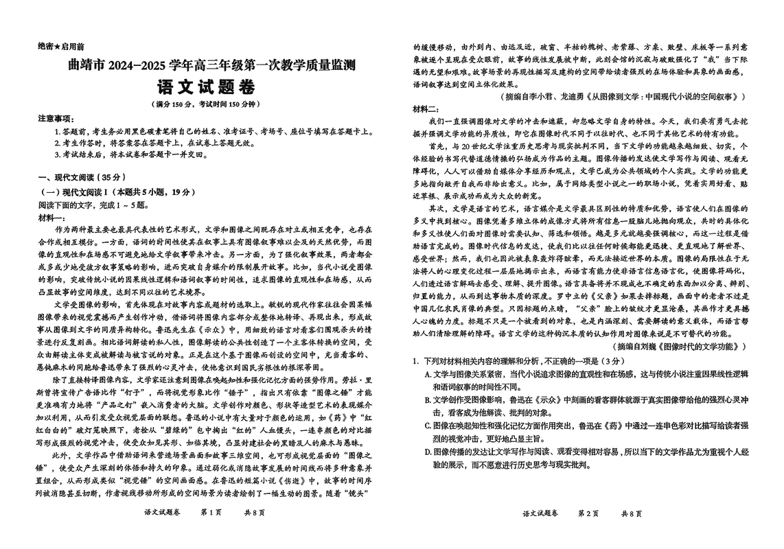 云南曲靖2025届高三上学期第一次教学质量监测语文试题及答案