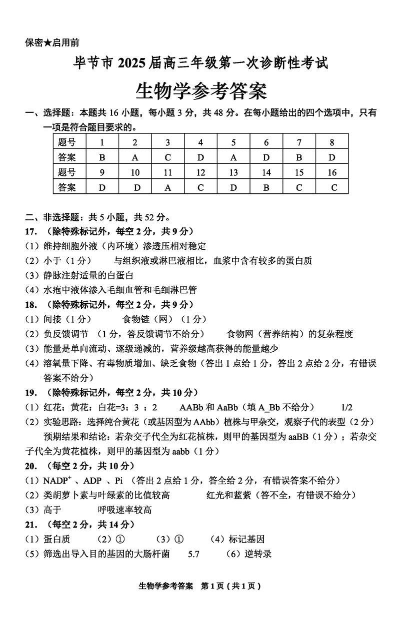 毕节一诊2025届高三上学期第一次诊断生物考试已于近日开考,为方便考生考后及时查看考试情况,查漏补缺、弥补不足,本文整理了试题答案解析相关信息!