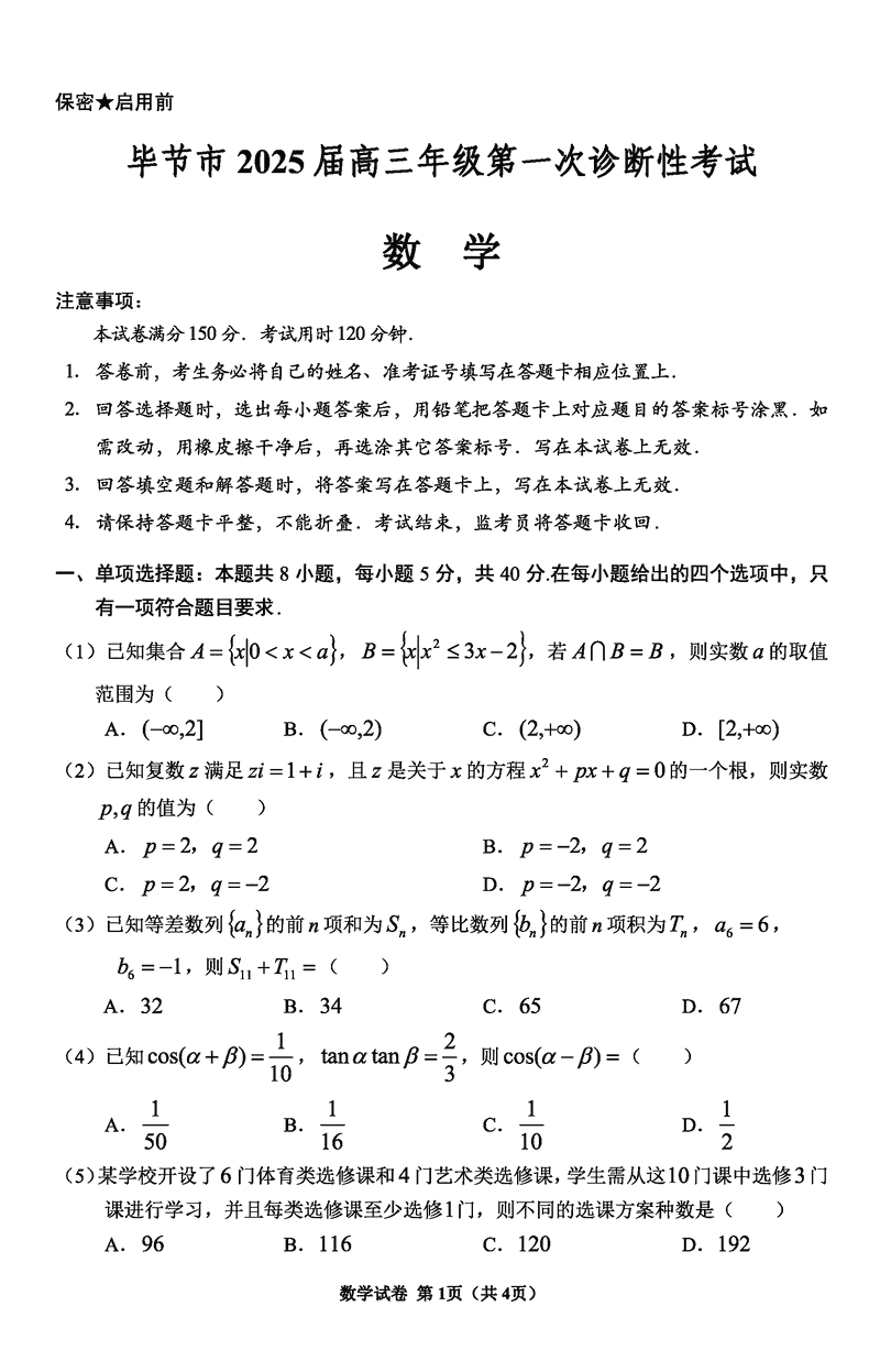 毕节一诊2025届高三上学期第一次诊断数学试题及答案