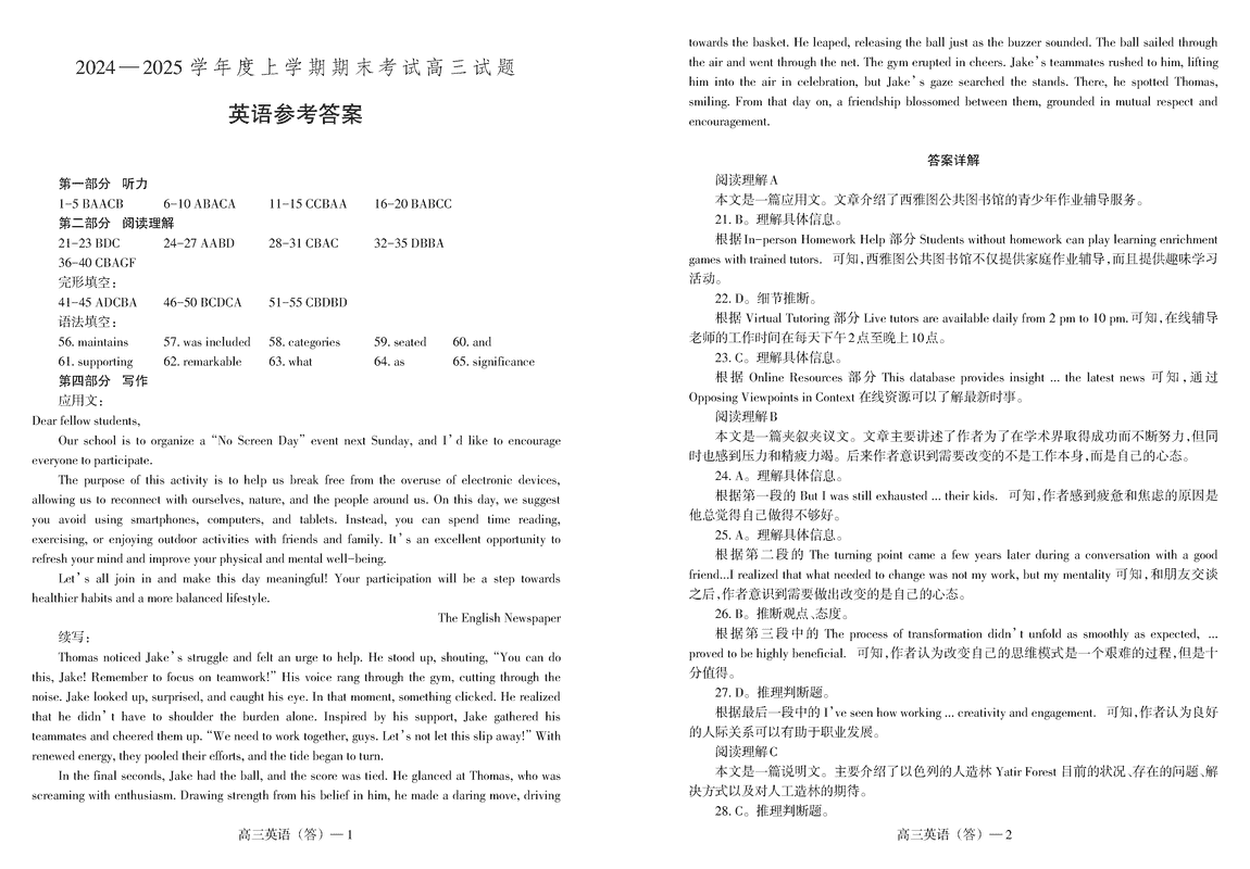 辽宁省省重点中学协作校2025届高三上学期1月期末英语试题及答案