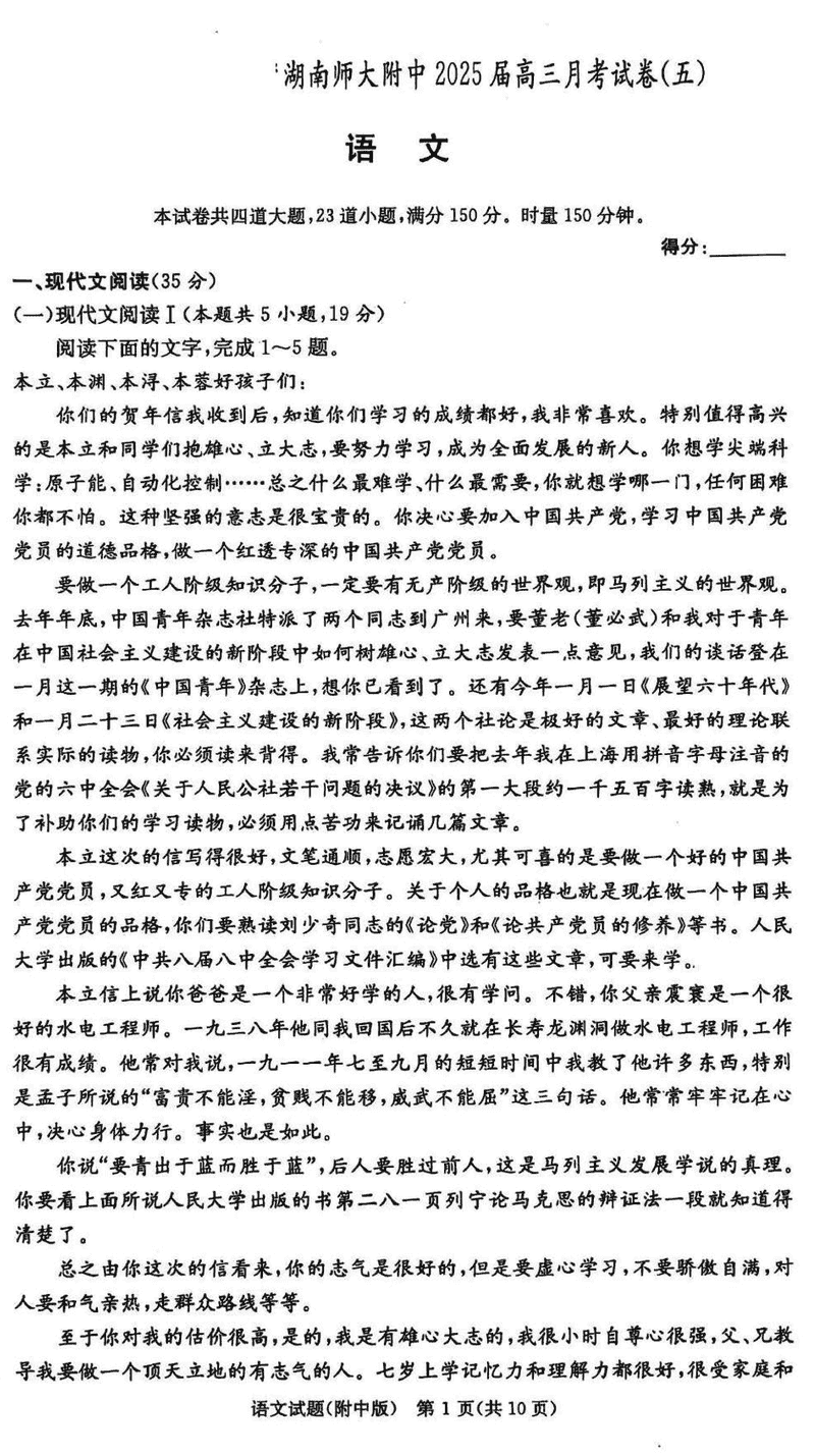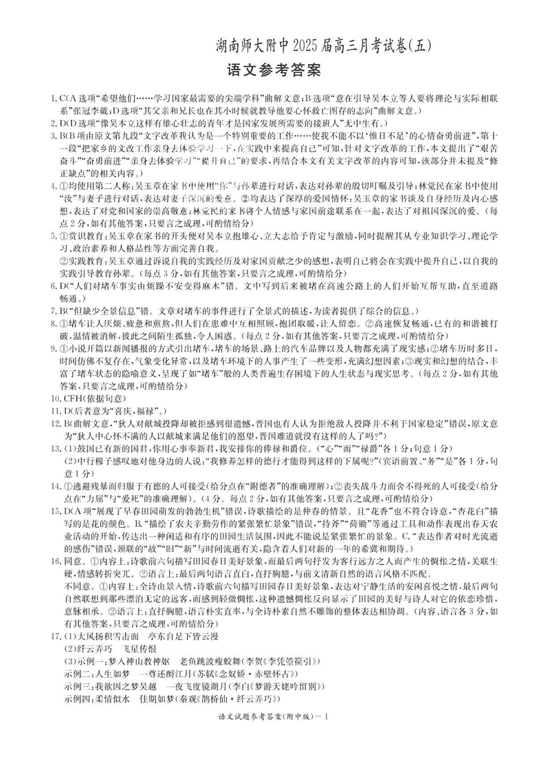 湖南师大附中2025届高三上学期月考(五)语文考试已于近日开考,为方便考生考后及时查看考试情况,查漏补缺、弥补不足,本文整理了试题答案解析相关信息!