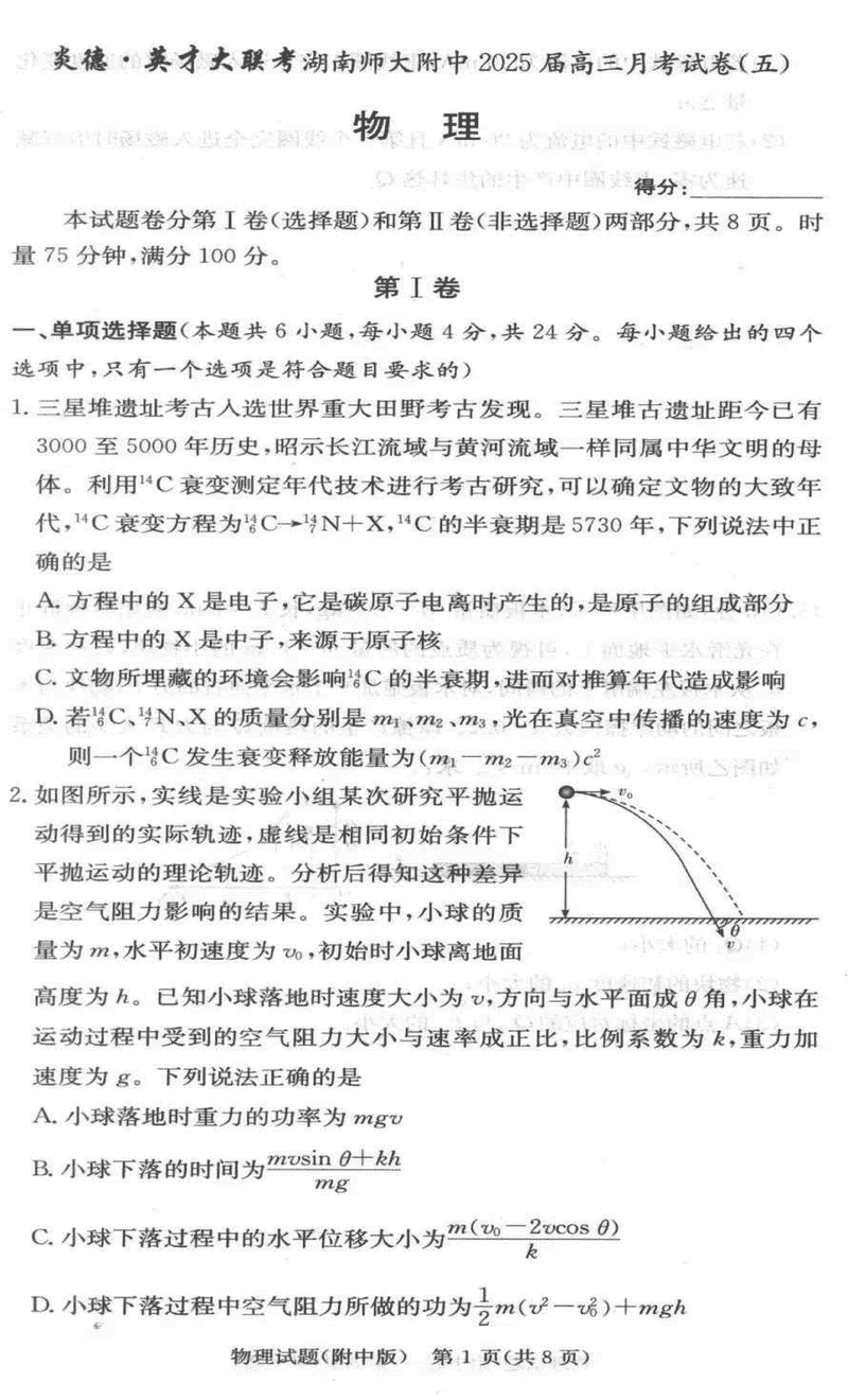 湖南师大附中2025届高三上学期月考(五)物理试题及答案