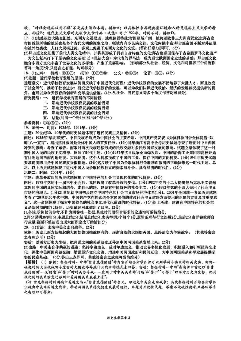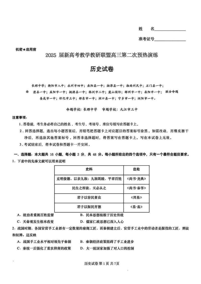 2025届湖南长郡二十校联盟高三上学期第二次预热历史试题及答案