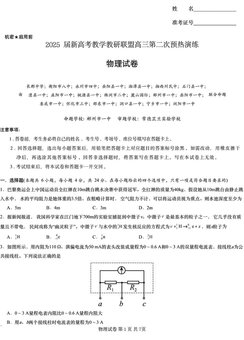 2025届湖南长郡二十校联盟高三上学期第二次预热物理试题及答案