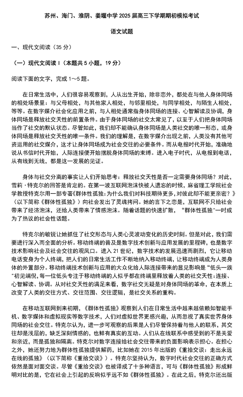 苏州中学、海门中学、淮阴中学、姜堰中学2025届高三下学期期初模拟语文试题及答案