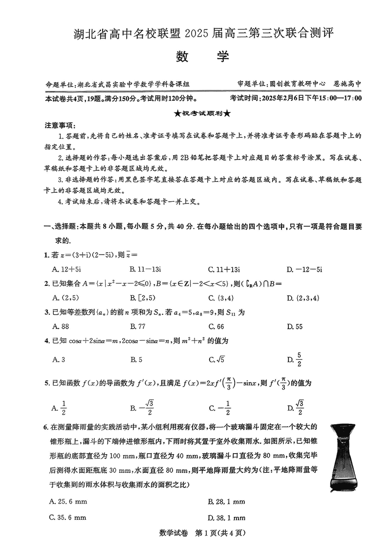 湖北圆创高中名校联盟2025届高三第三次联合测评数学试题及答案