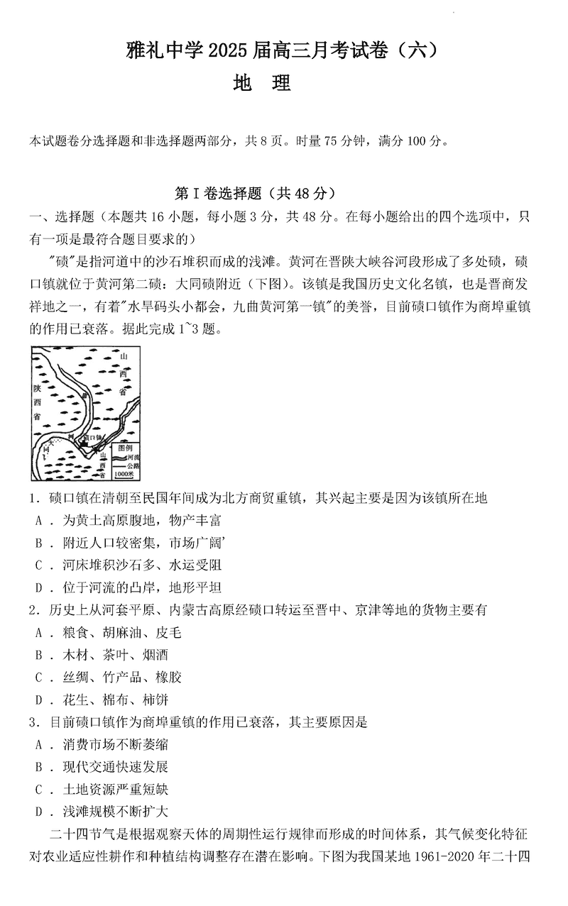 湖南雅礼中学2025届高三月考试卷(六)地理试题及答案