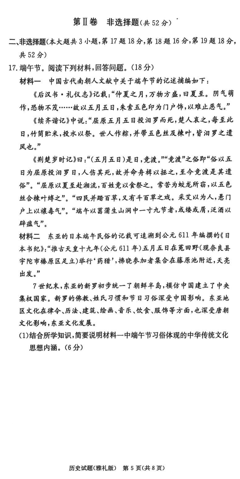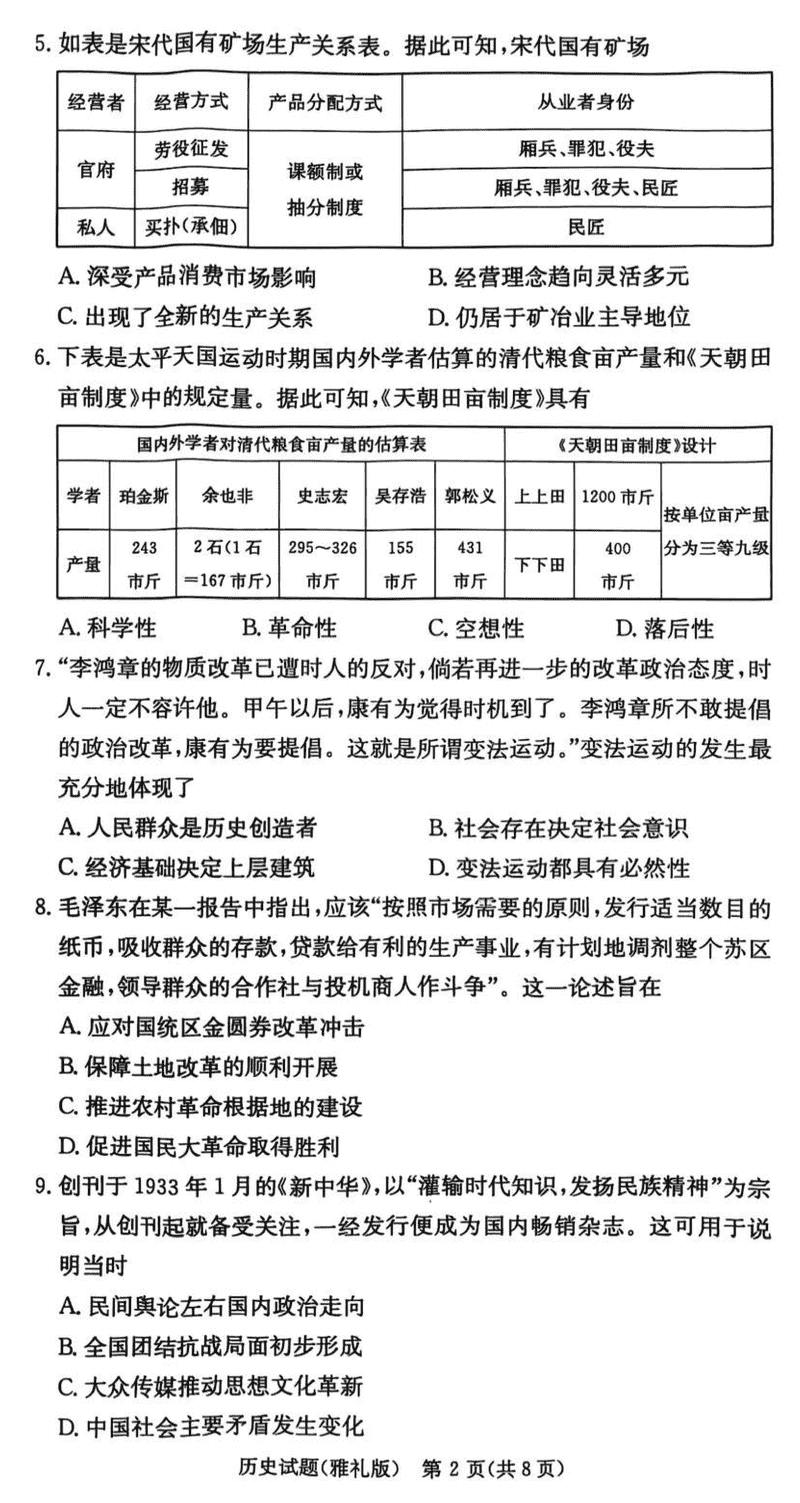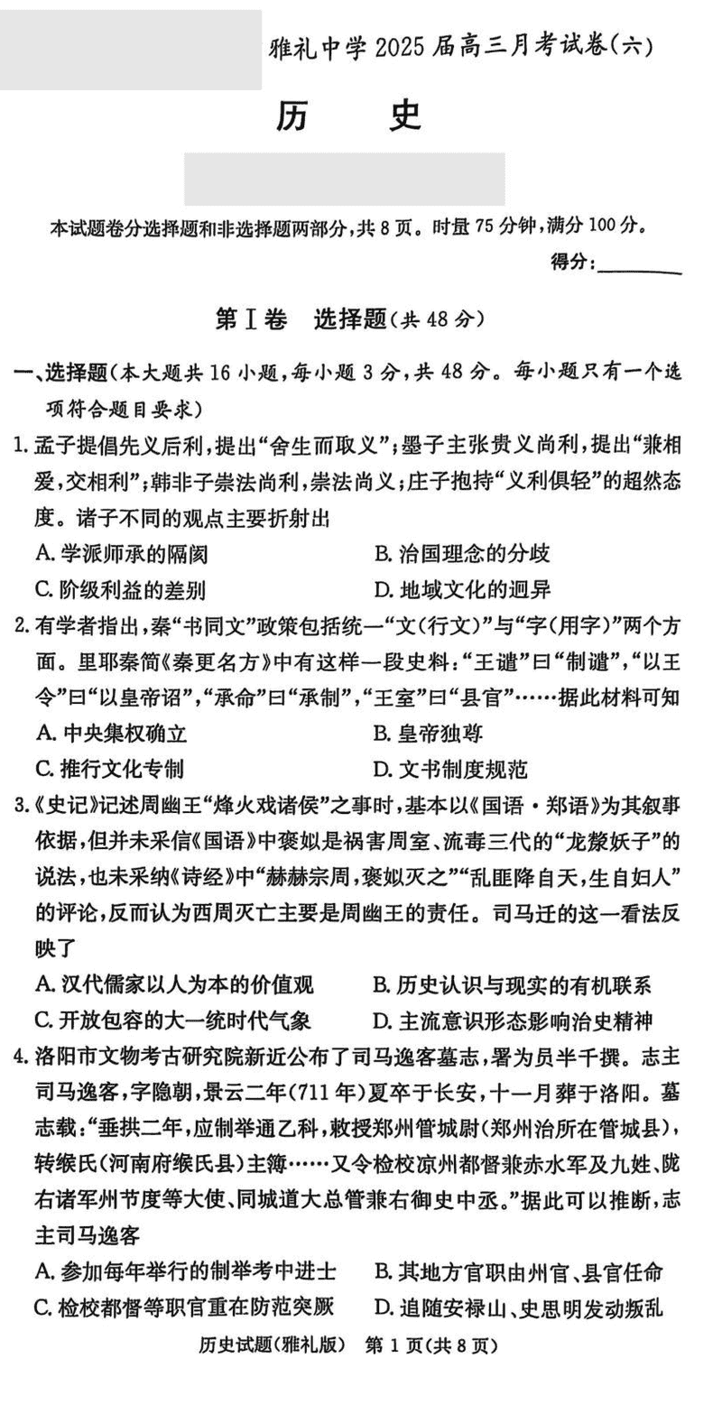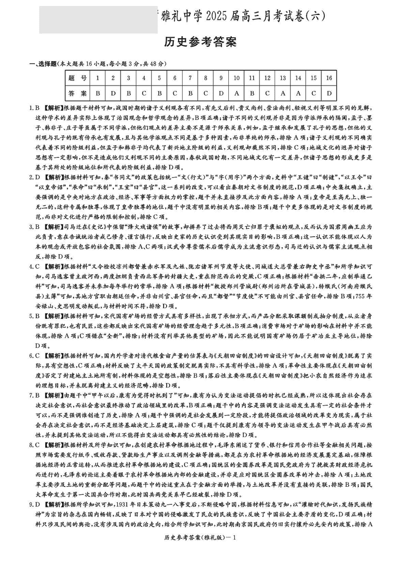 湖南雅礼中学2025届高三月考试卷(六)历史试题及答案
