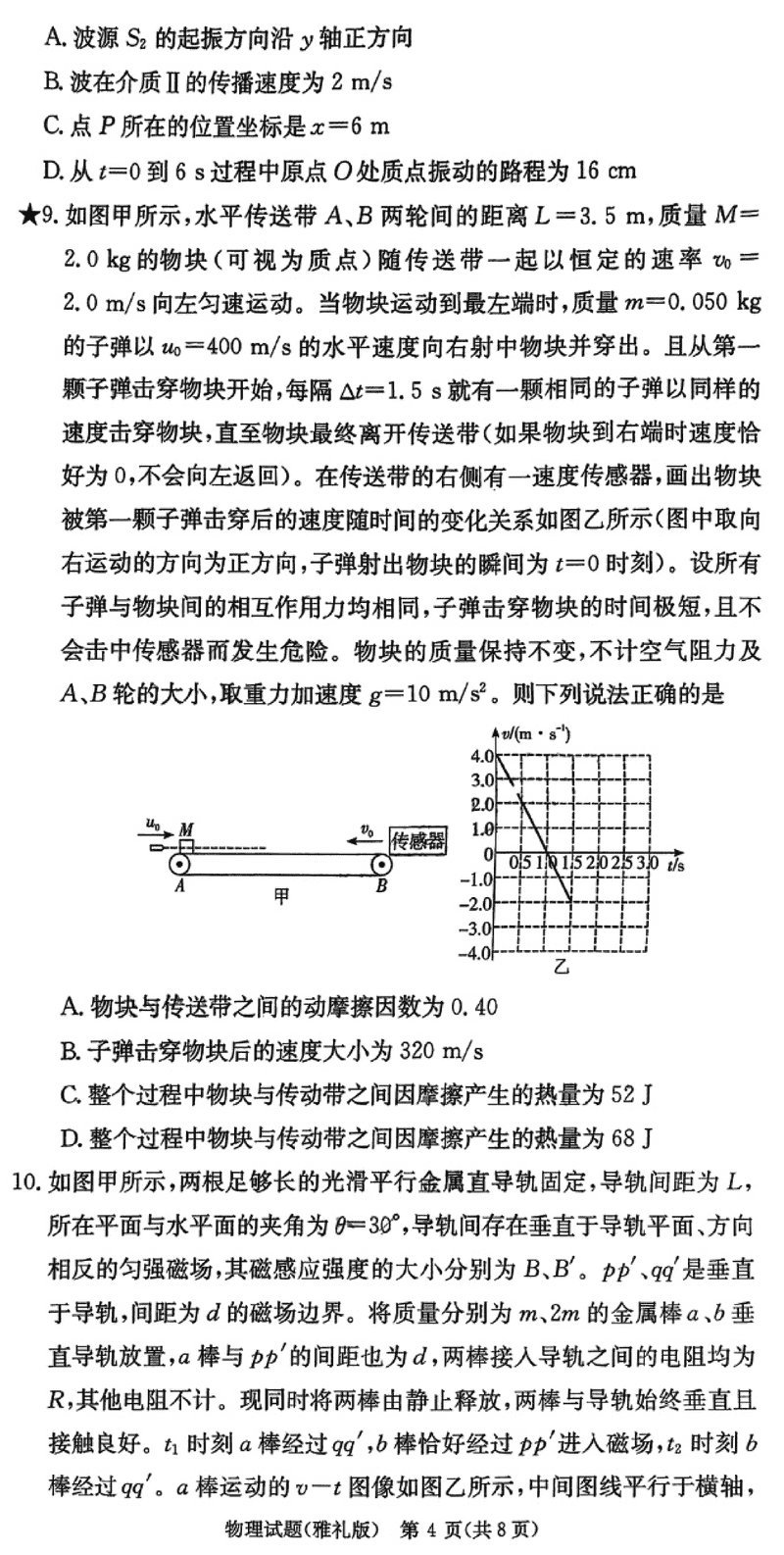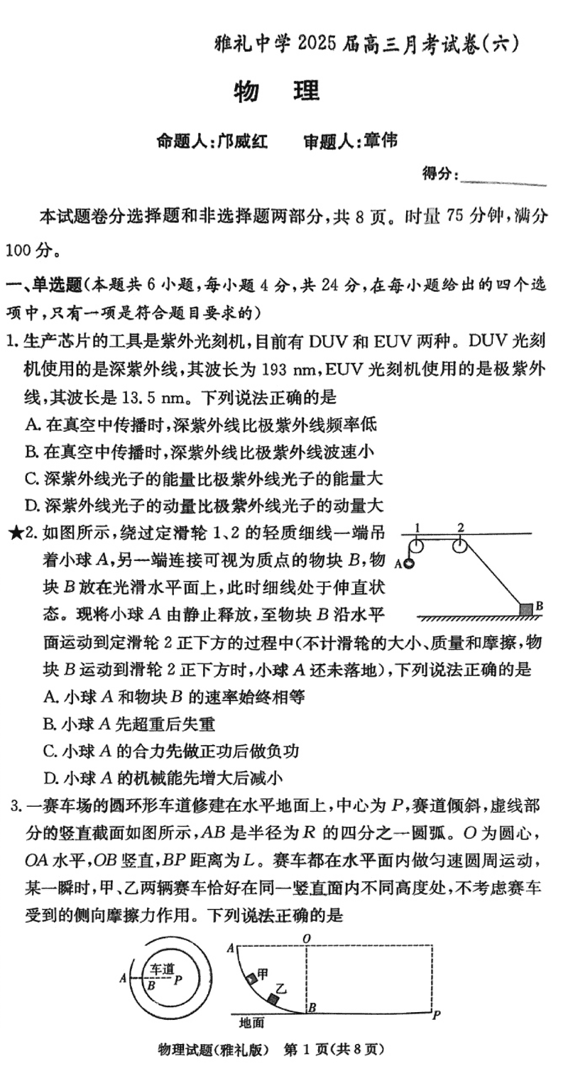 湖南雅礼中学2025届高三月考试卷(六)物理试题及答案
