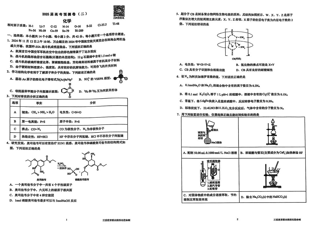 陕西省三重教育2025届高考预测卷(二)化学试题及答案