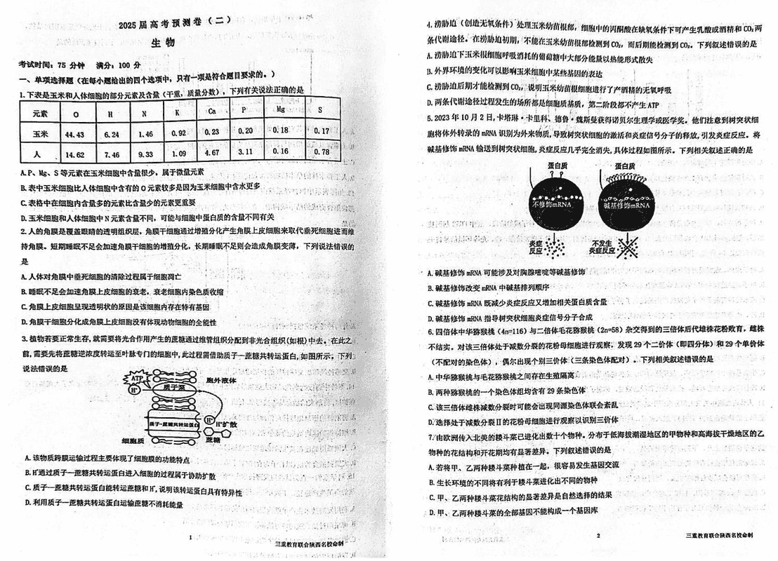 陕西省三重教育2025届高考预测卷(二)生物试题及答案