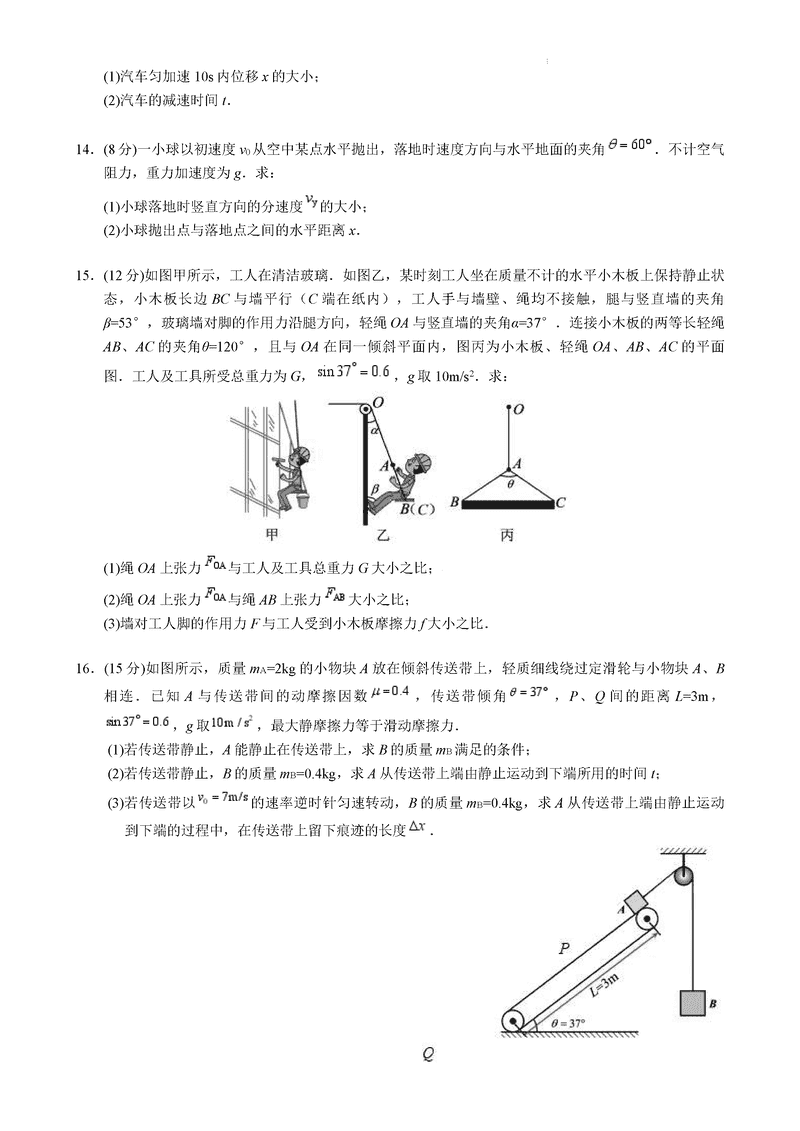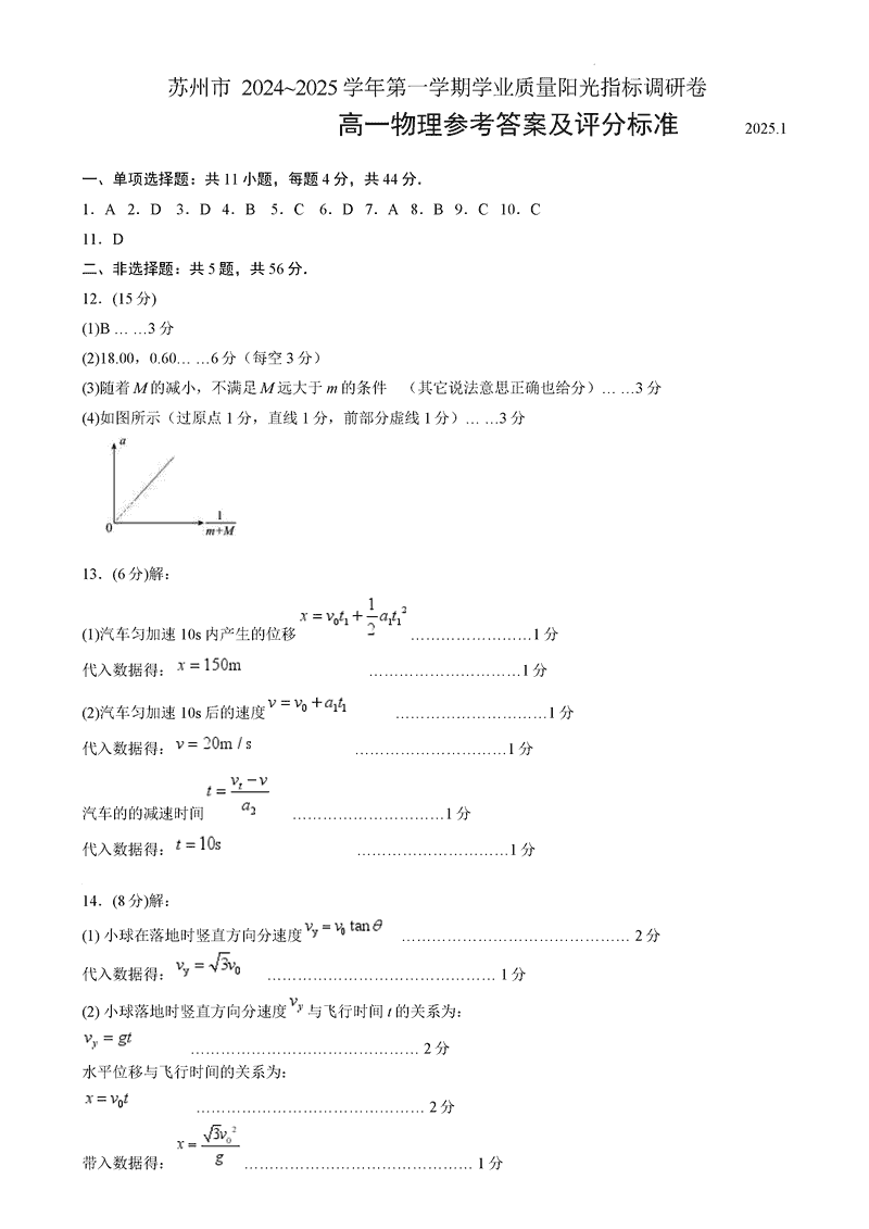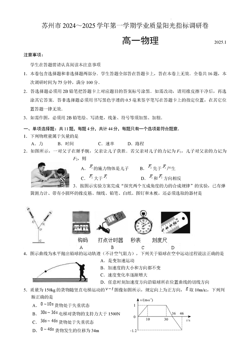 苏州2024-2025学年高一上学期1月期末学业阳光指标调研物理试题及答案
