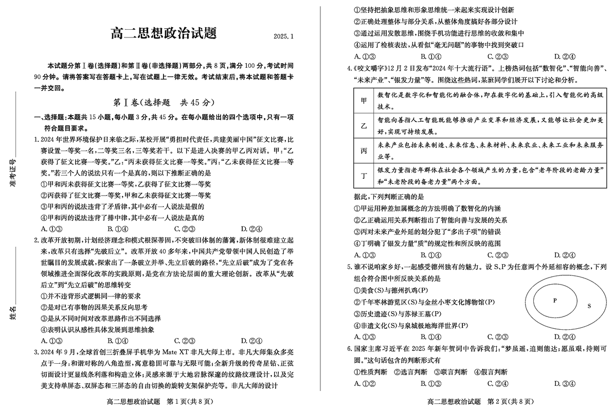 山东德州2024-2025学年高二上学期1月联考政治试题及答案 时间:2025-02-07 山东 高中政治 山东德州2024-2025学年高二上学期1月联考政治考试已于近日开考,为方便考生考后及时查看考试情况,查漏补缺、弥补不足,本文整理了试题答案解析相关信息! 政治试题及答案解析