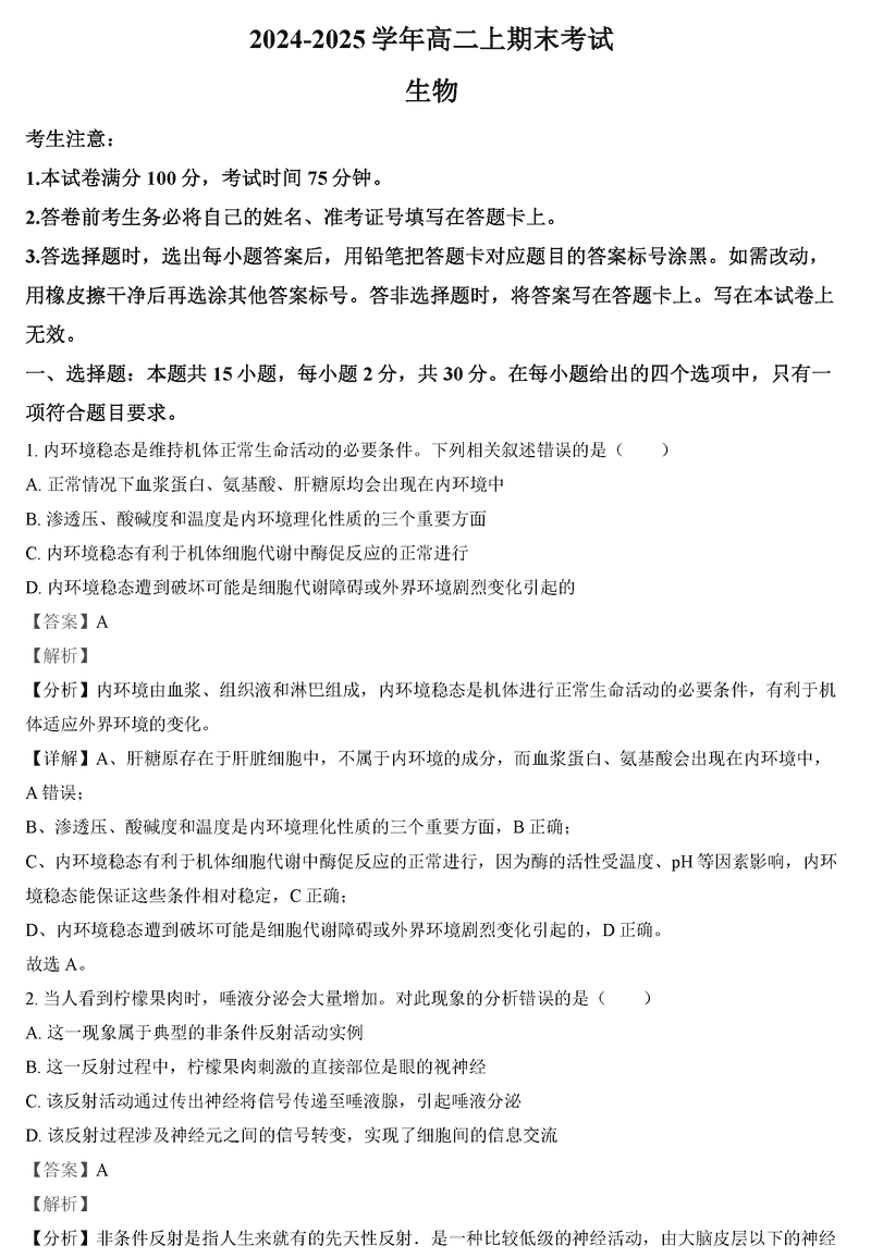 吉林八校联考2024-2025学年高二上学期1月期末生物试题及答案 时间:2025-02-07 吉林 高中生物 吉林省八校联考2024-2025学年高二上学期1月期末生物考试已于近日开考,为方便考生考后及时查看考试情况,查漏补缺、弥补不足,本文整理了试题答案解析相关信息! 生物试题及答案解析