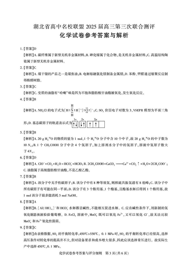 湖北圆创高中名校联盟2025届高三第三次联合测评化学试题及答案