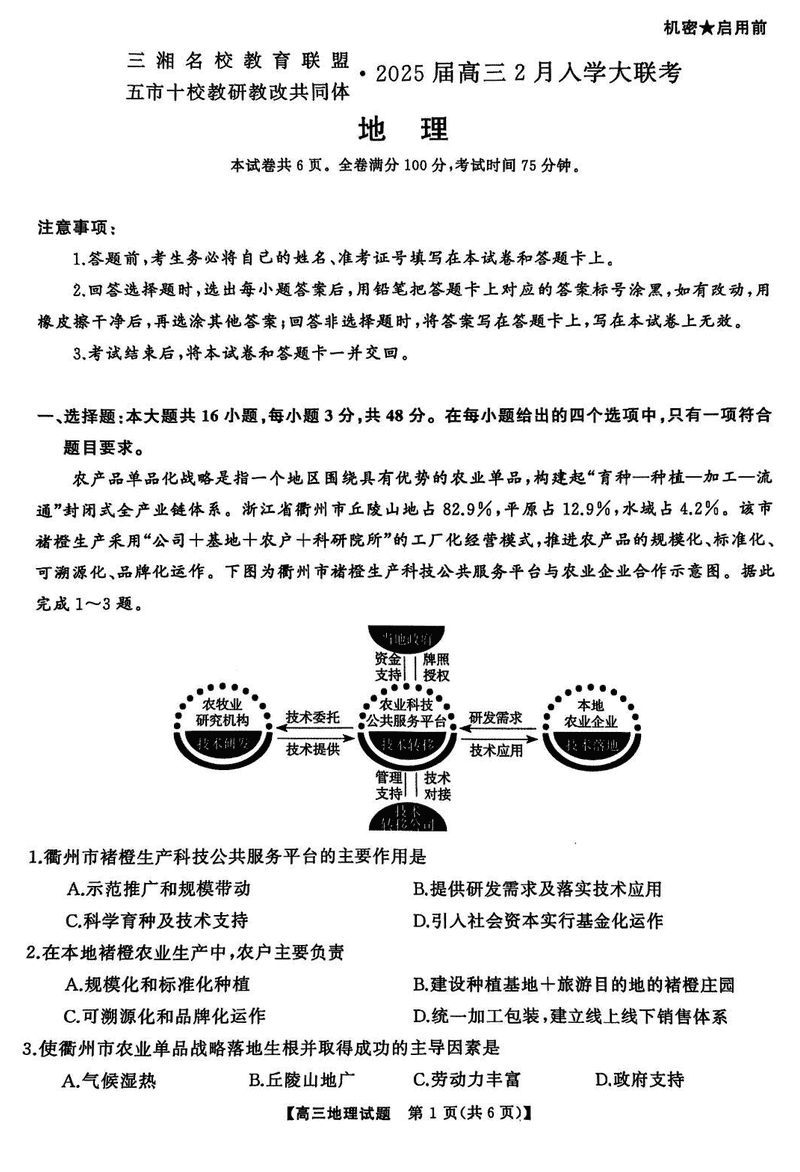 2025届三湘名校教育联盟五市十校教研教改共同体高三下2月入学大联考地理考试已于近日开考,为方便考生考后及时查看考试情况,查漏补缺、弥补不足,本文整理了试题答案解析相关信息!