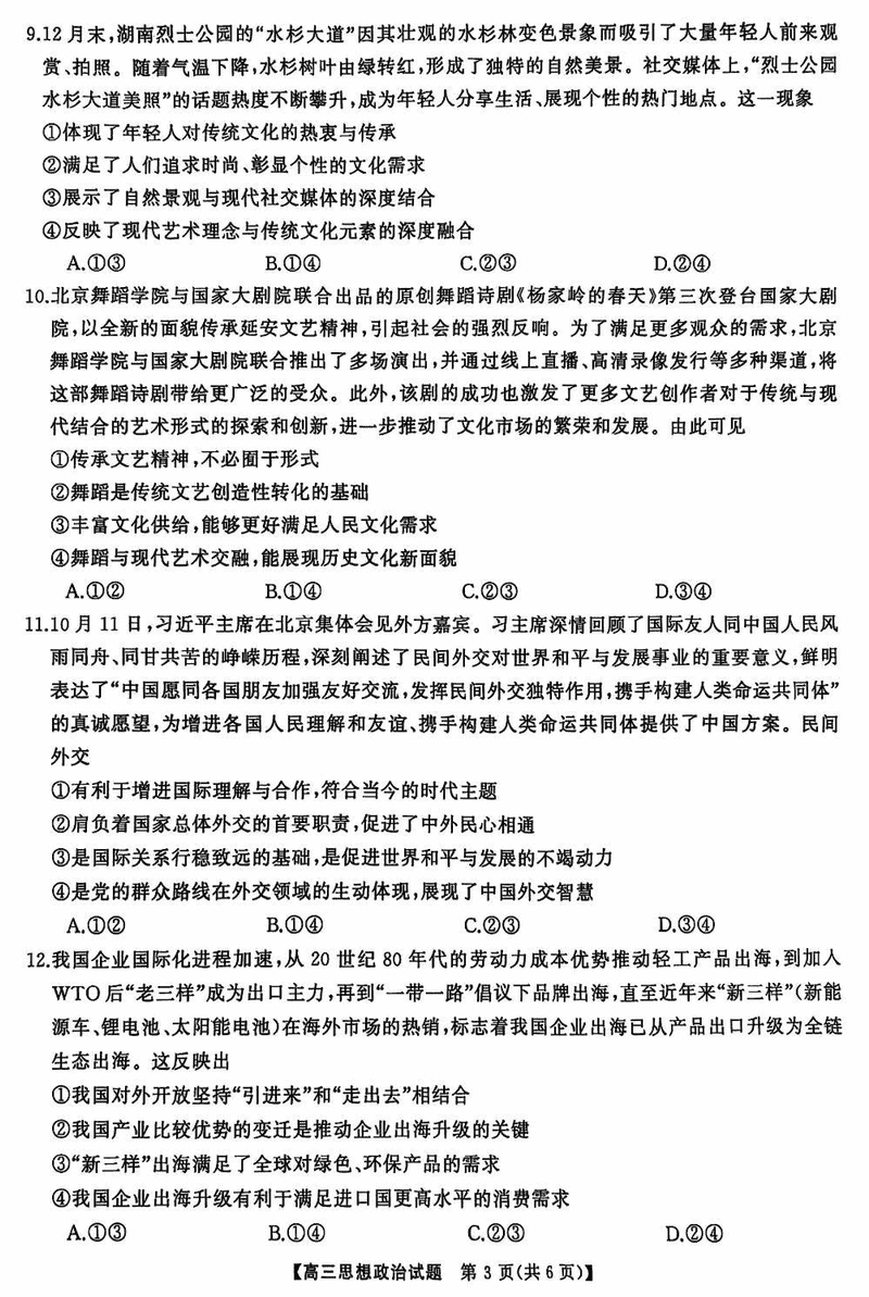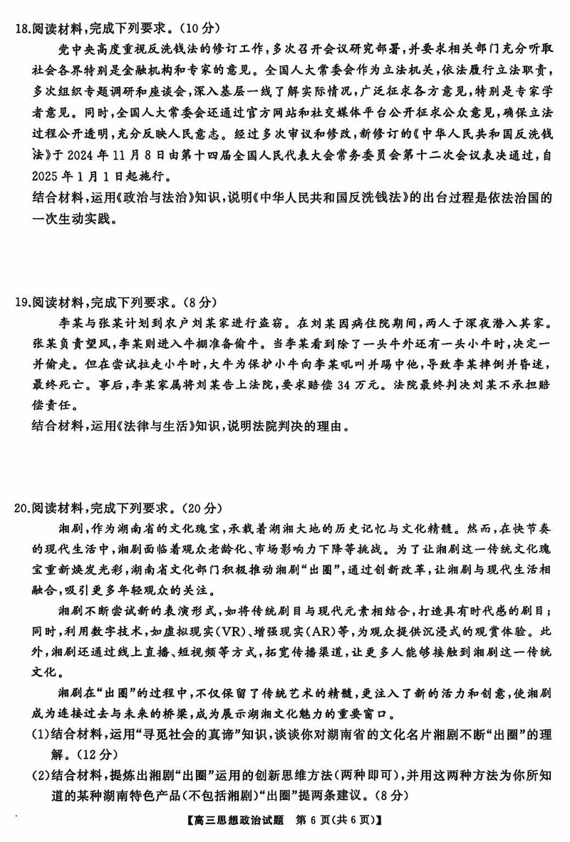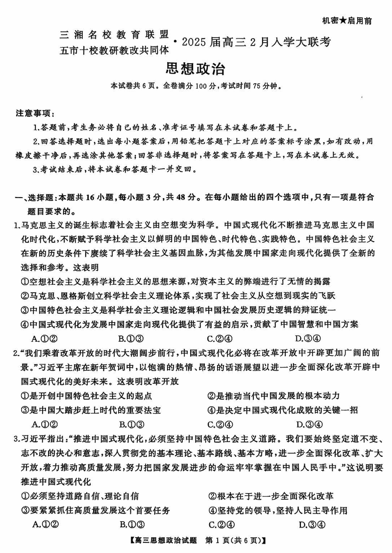2025届三湘名校教育联盟五市十校教研教改共同体高三下2月入学大联考政治试题及答案