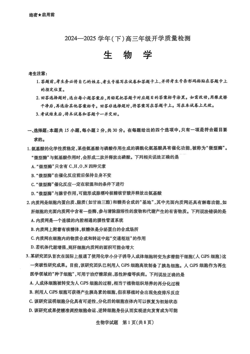 山东天一大联考齐鲁名校教研共同体2025年高三下开学质检生物试题及答案