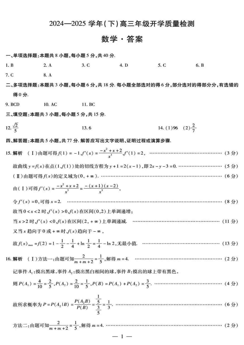 山东天一大联考齐鲁名校教研共同体2025年高三下开学质检数学试题及答案