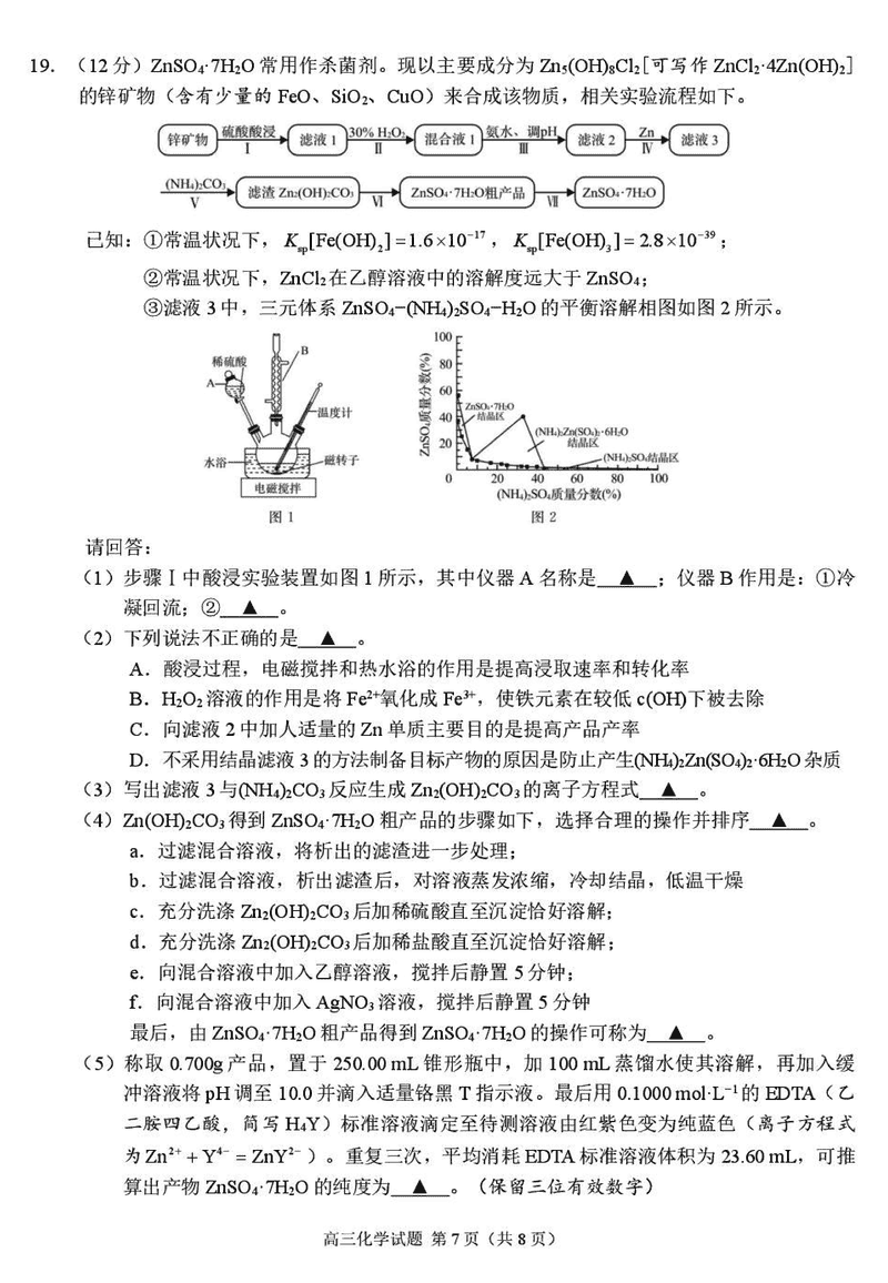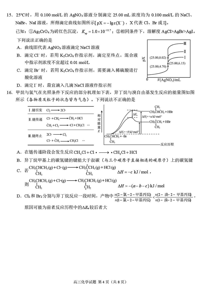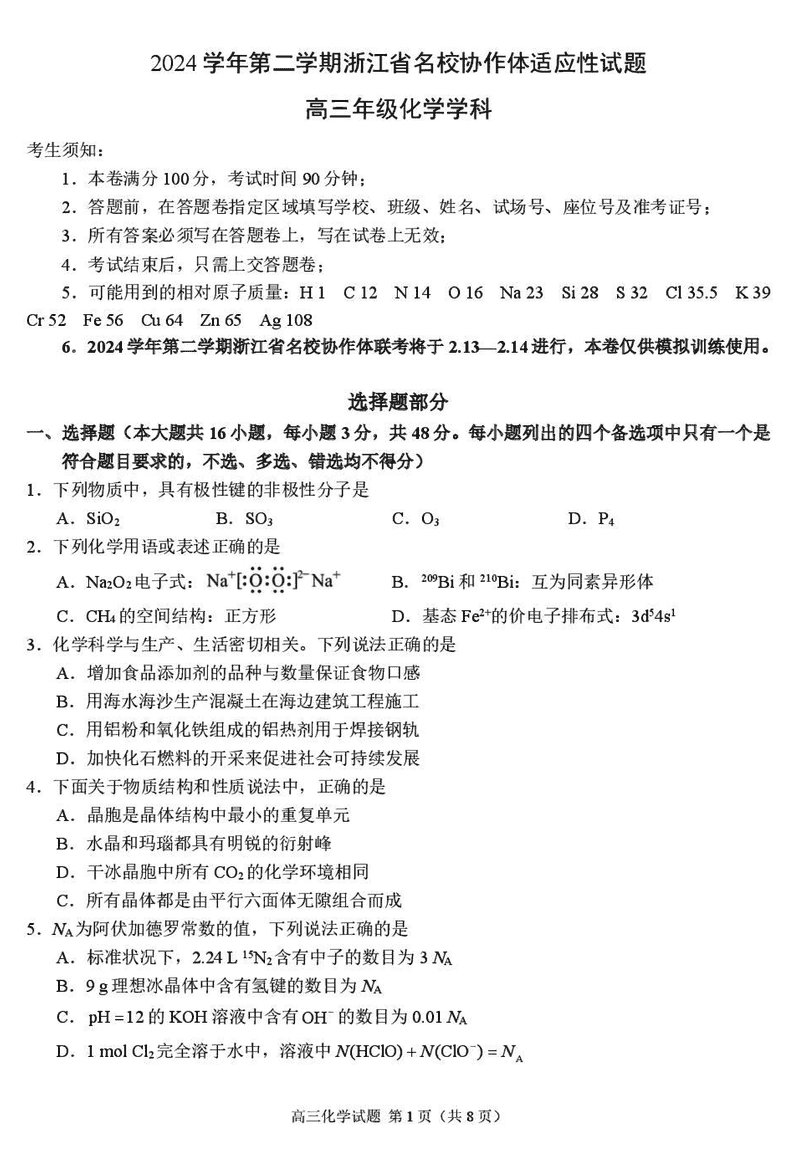 浙江名校协作体2025届高三下学期开学适应性化学试题及答案