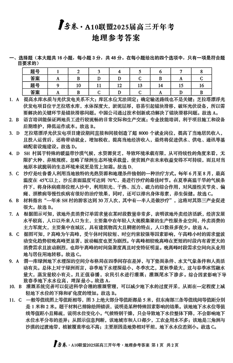 安徽省A10联盟2025届高三下学期开年考地理试题及答案