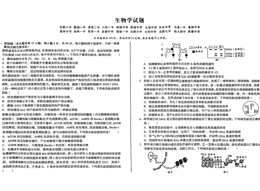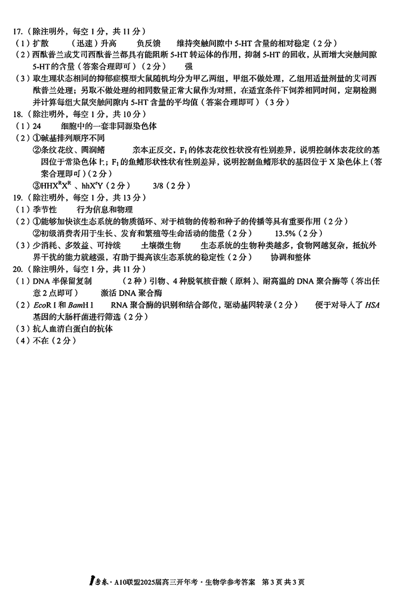 安徽省A10联盟2025届高三下学期开年考生物试题及答案