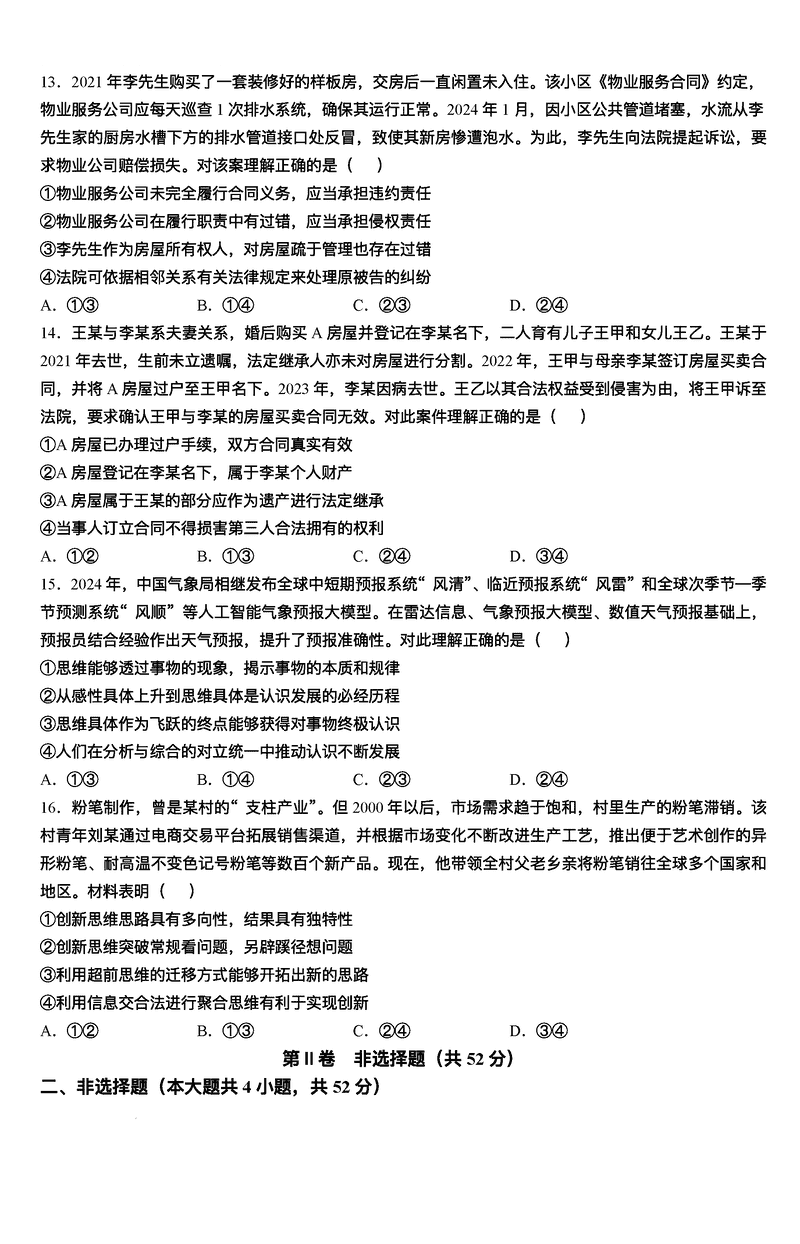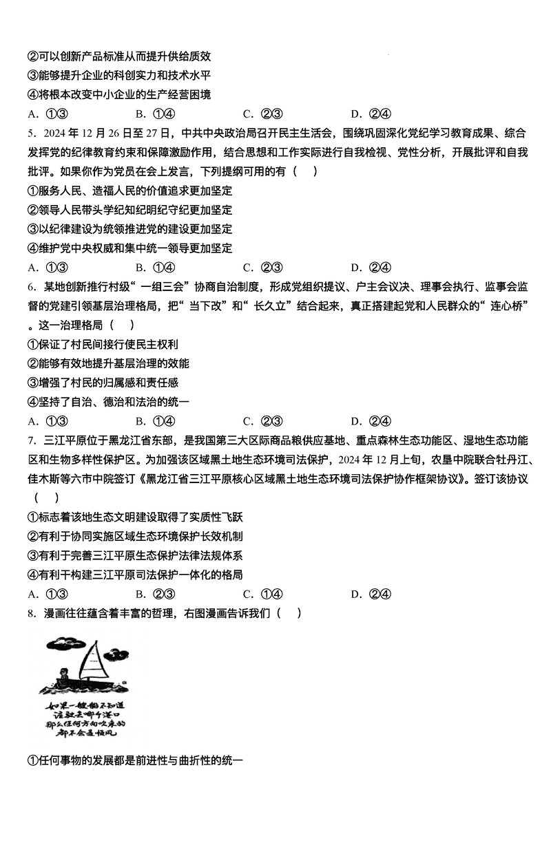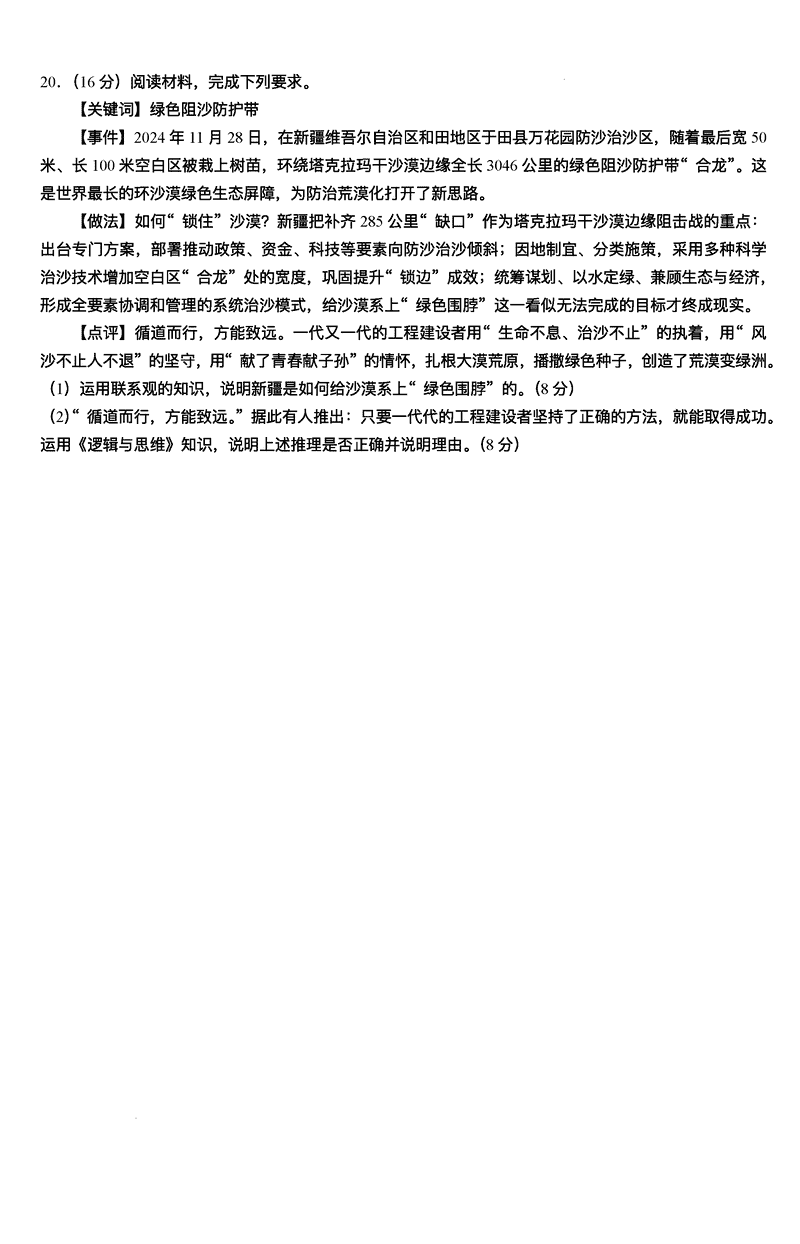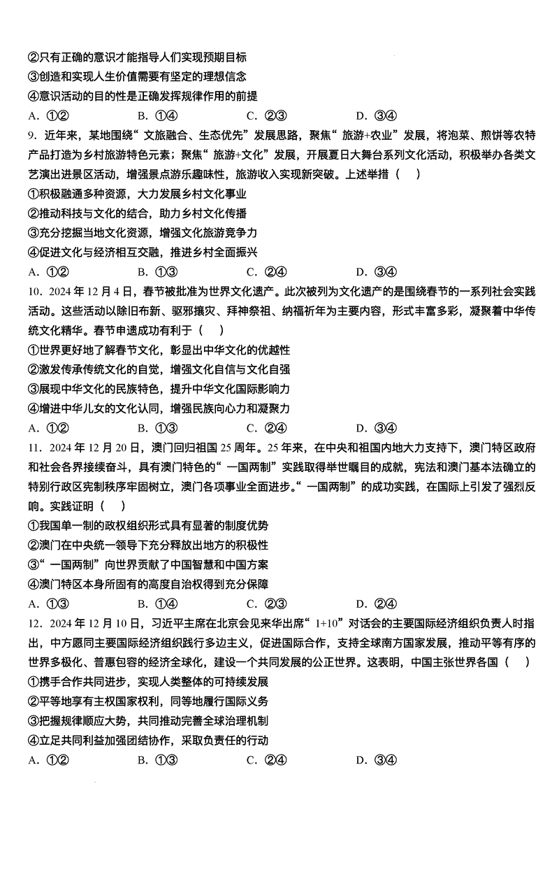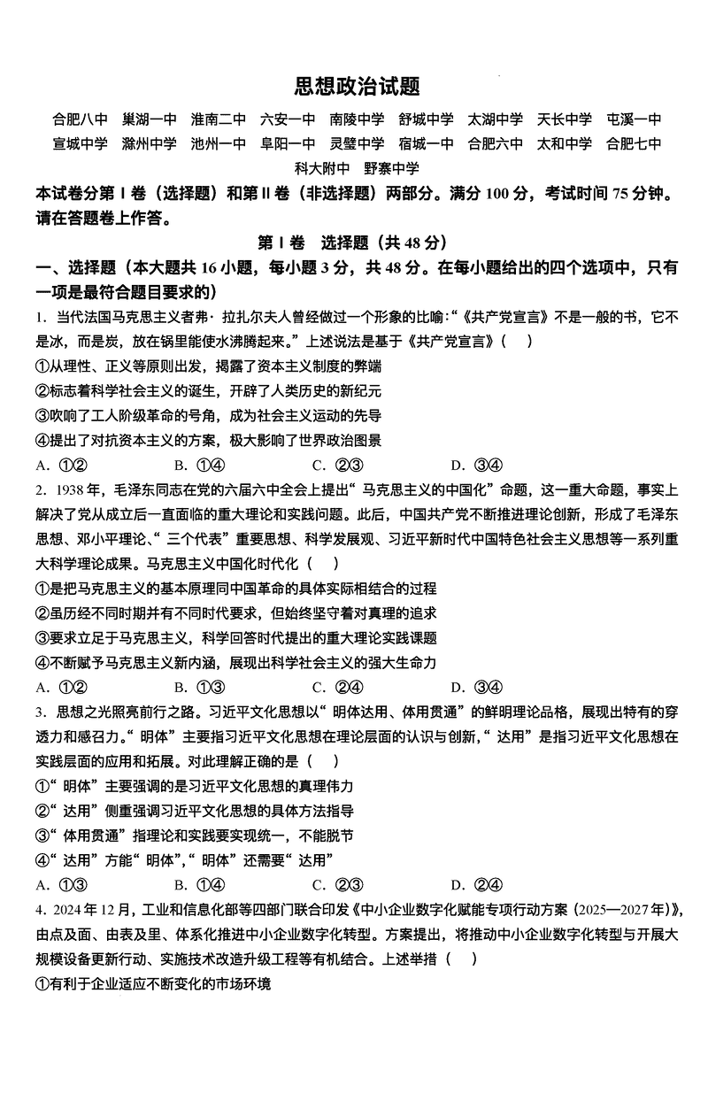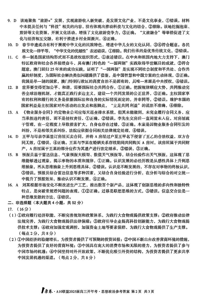 安徽省A10联盟2025届高三下学期开年考政治试题及答案