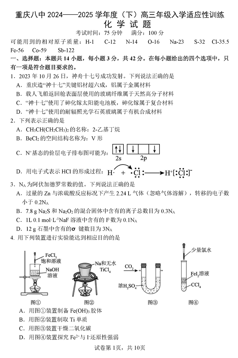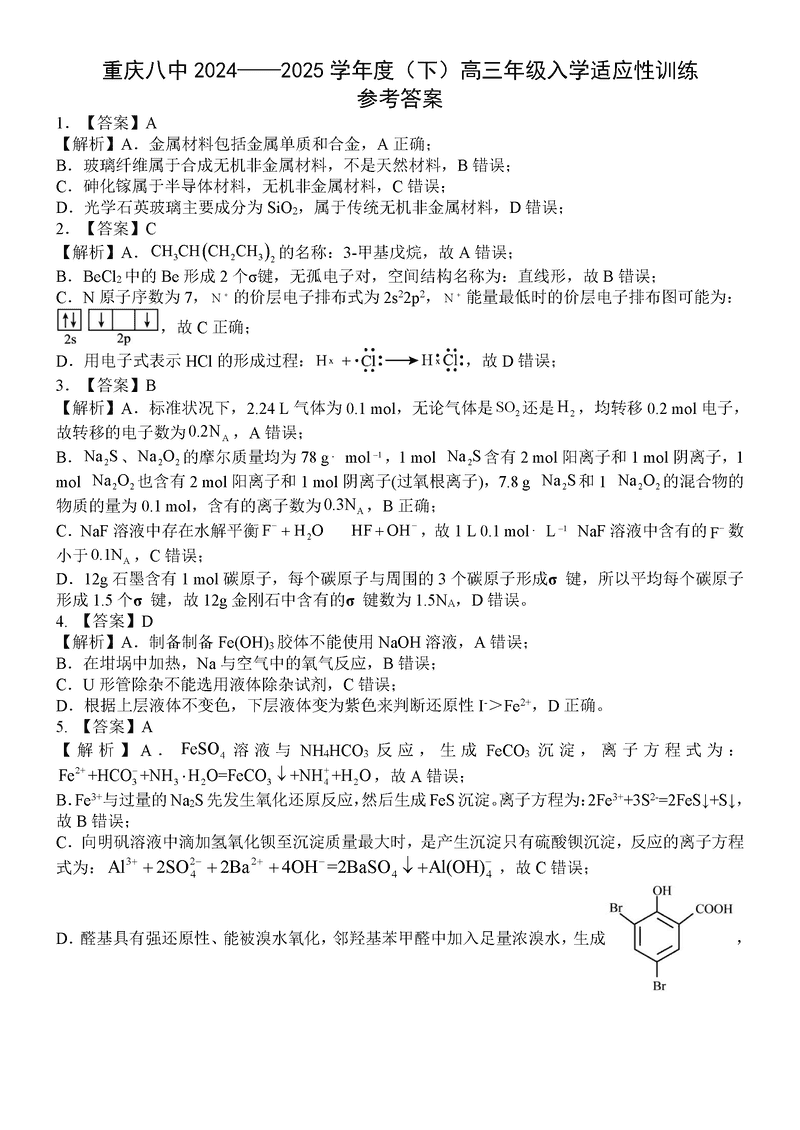 重庆八中2024-2025学年度高三下入学化学考试已于近日开考,为方便考生考后及时查看考试情况,查漏补缺、弥补不足,本文整理了试题答案解析相关信息!