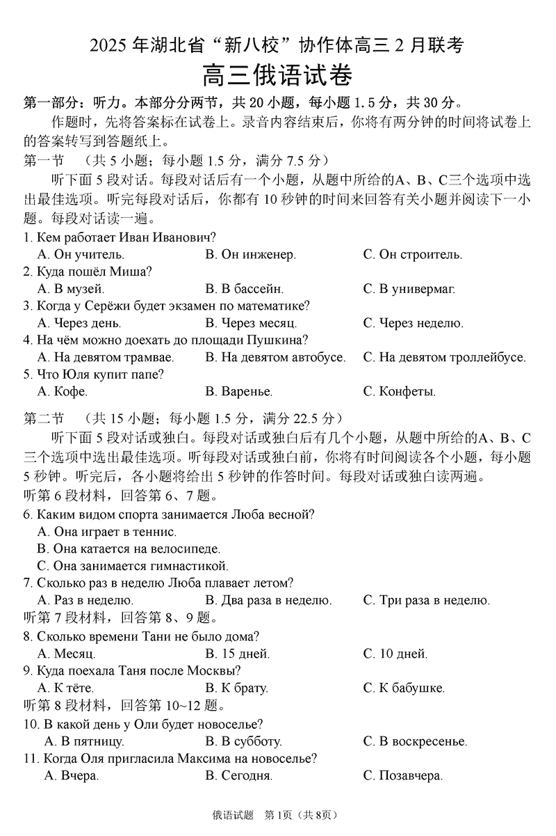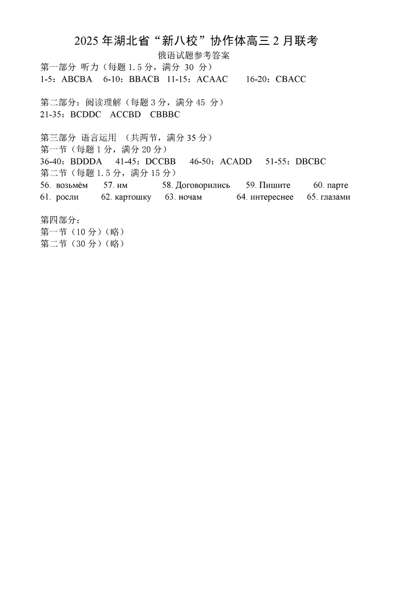 2025年湖北省新八校协作体高三2月联考俄语试题及答案