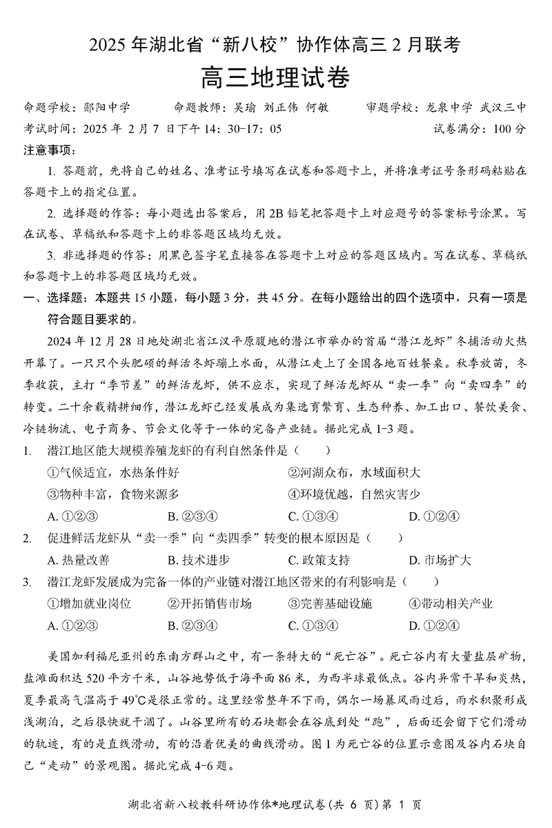 2025年湖北省新八校协作体高三2月联考地理试题及答案