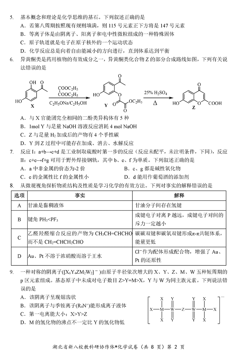 2025年湖北省新八校协作体高三2月联考化学试题及答案