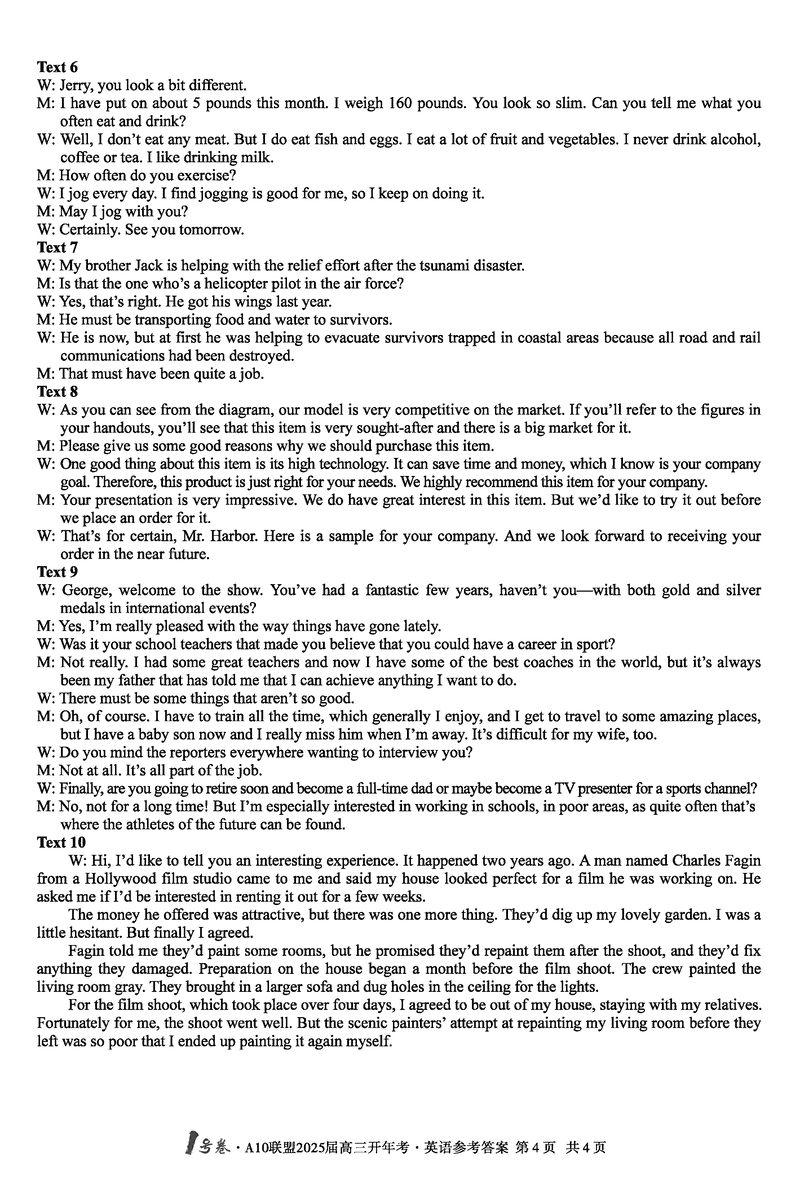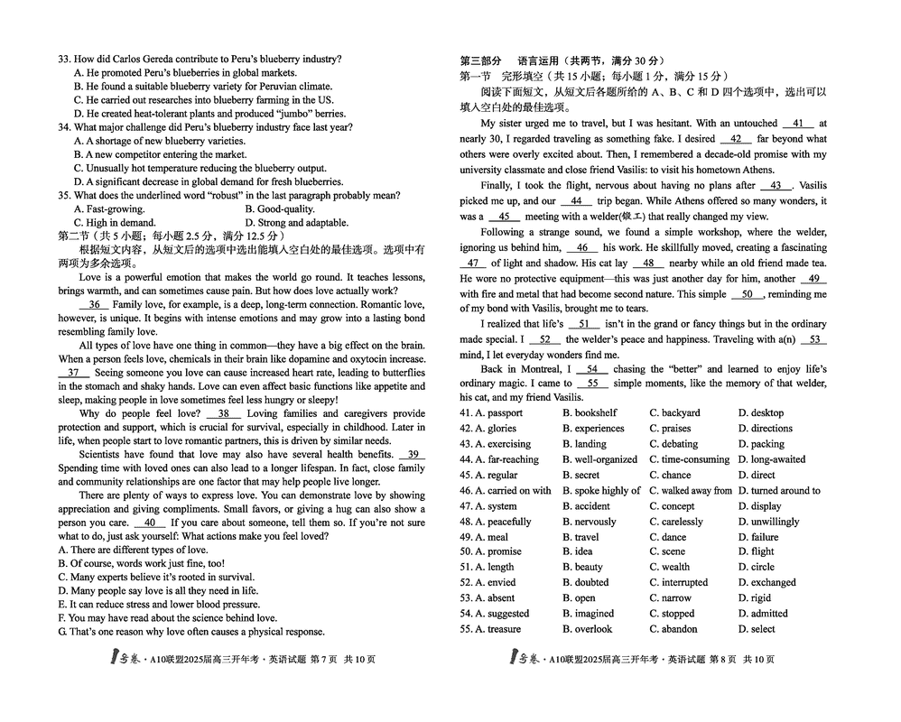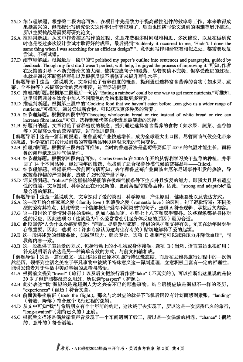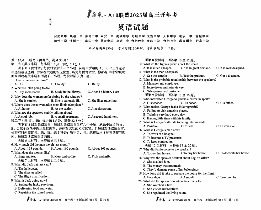 安徽省A10联盟2025届高三下学期开年考英语试题及答案