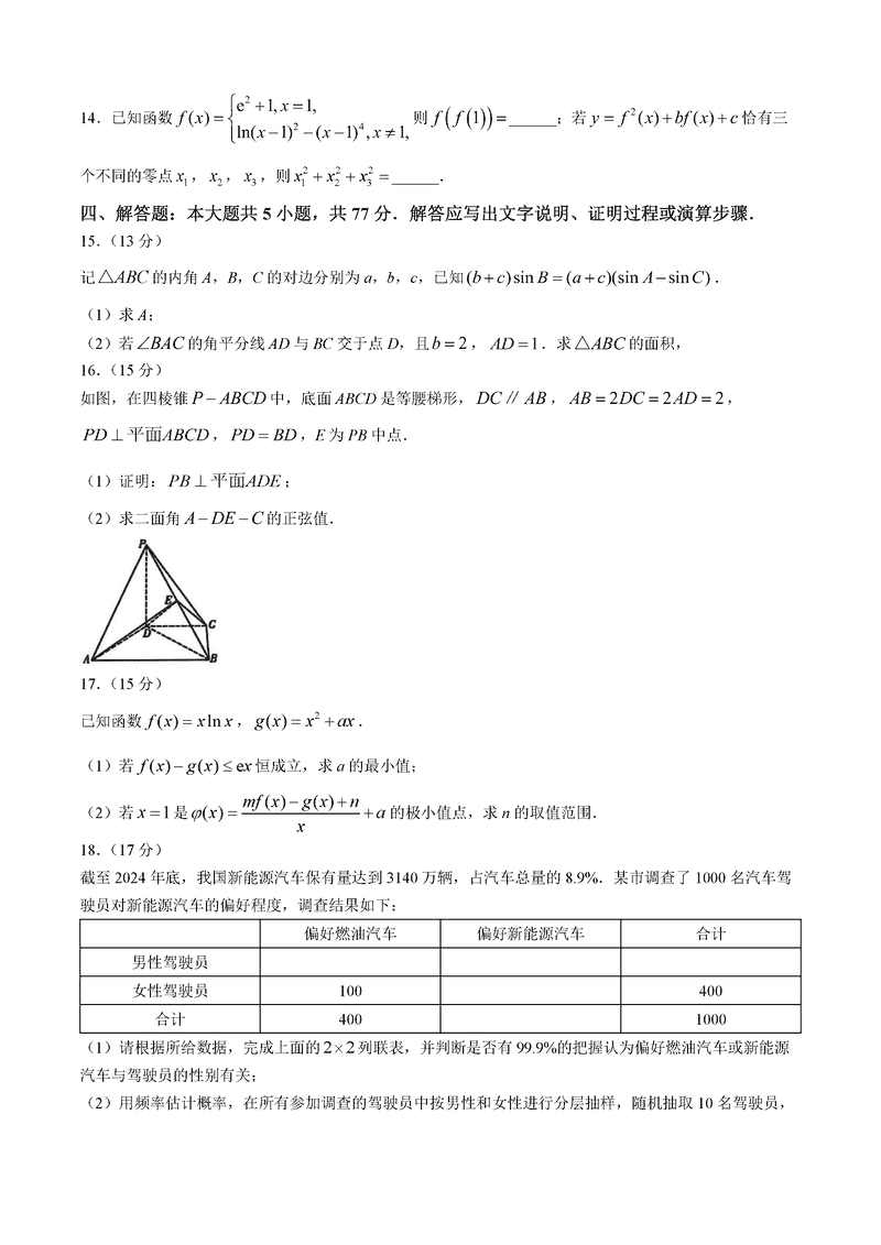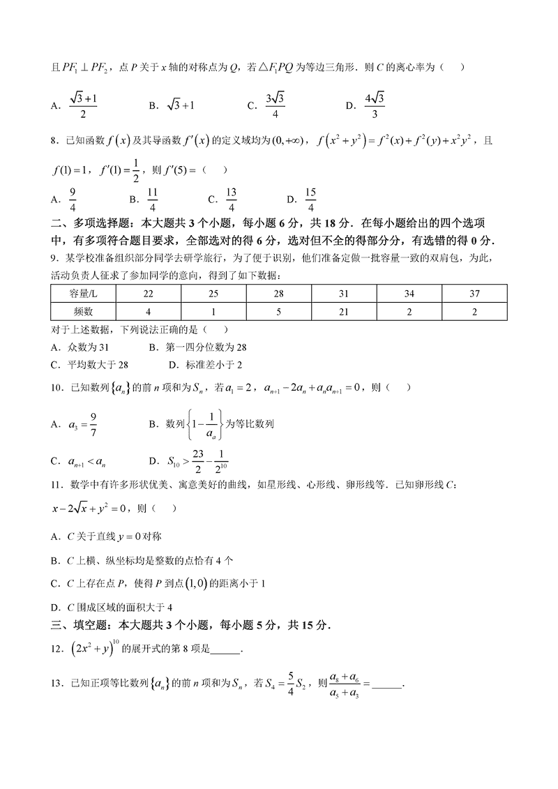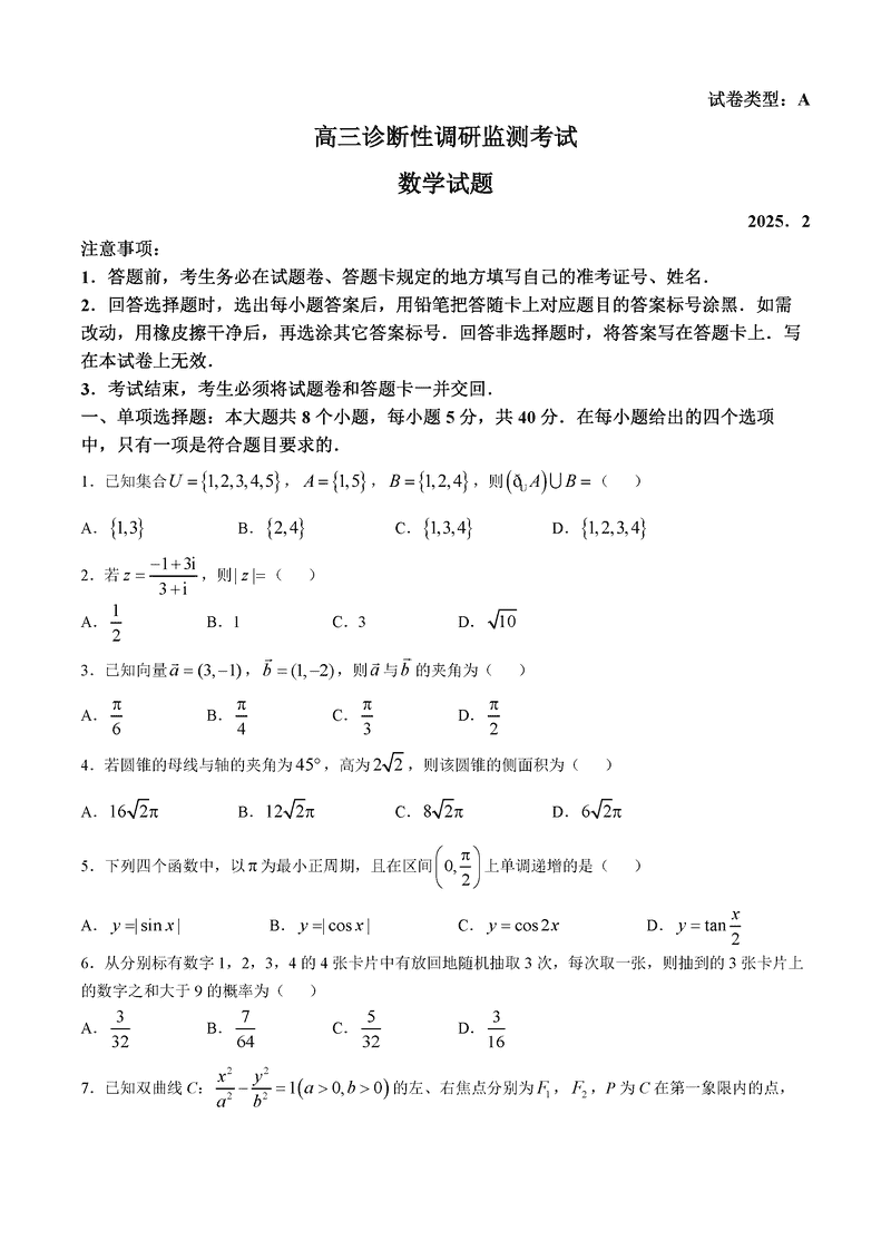 山东潍坊2025届高三2月诊断性调研监测数学试题及答案